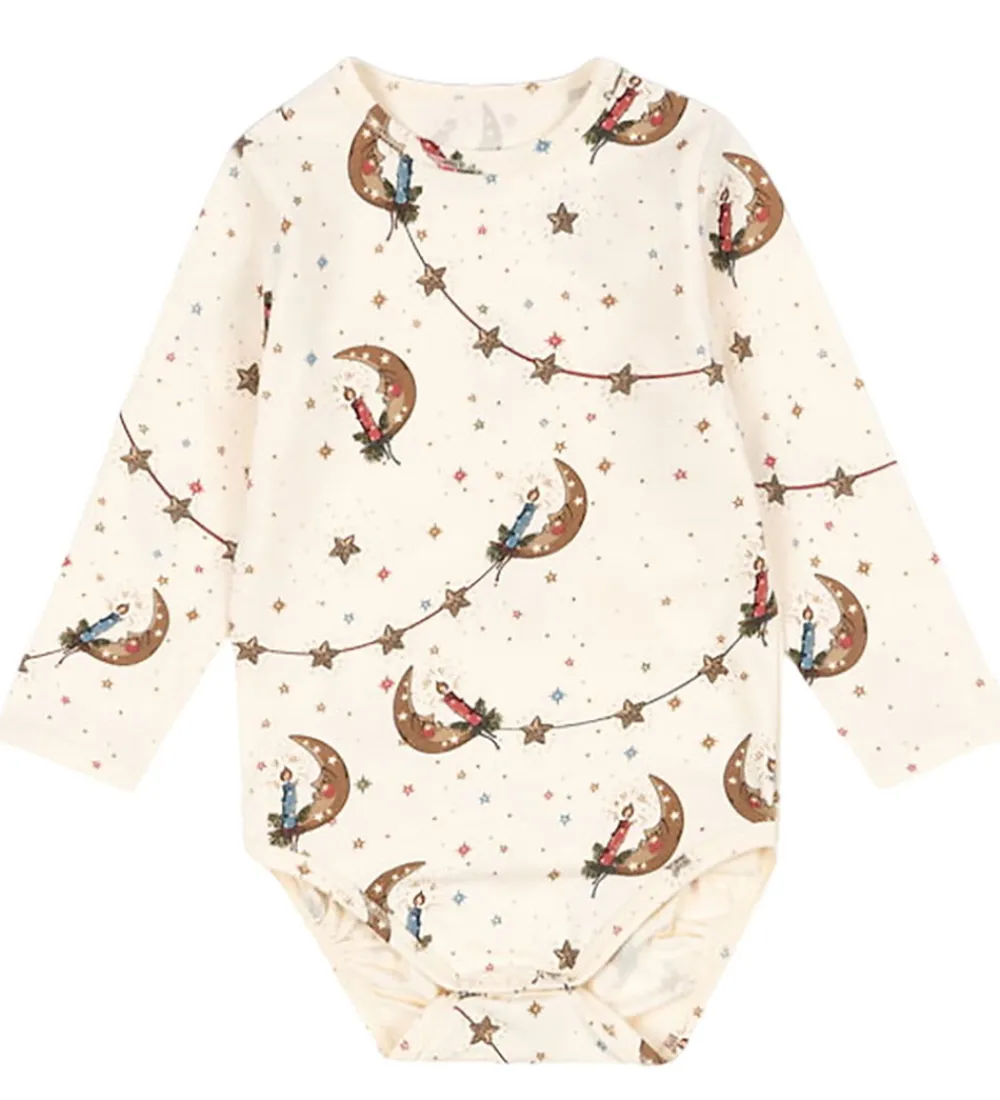 Charmerende Konges Sløjd sæt bestående af en body og et par leggings i beige med et farverigt eventyrligt måne- og stjernemønster.