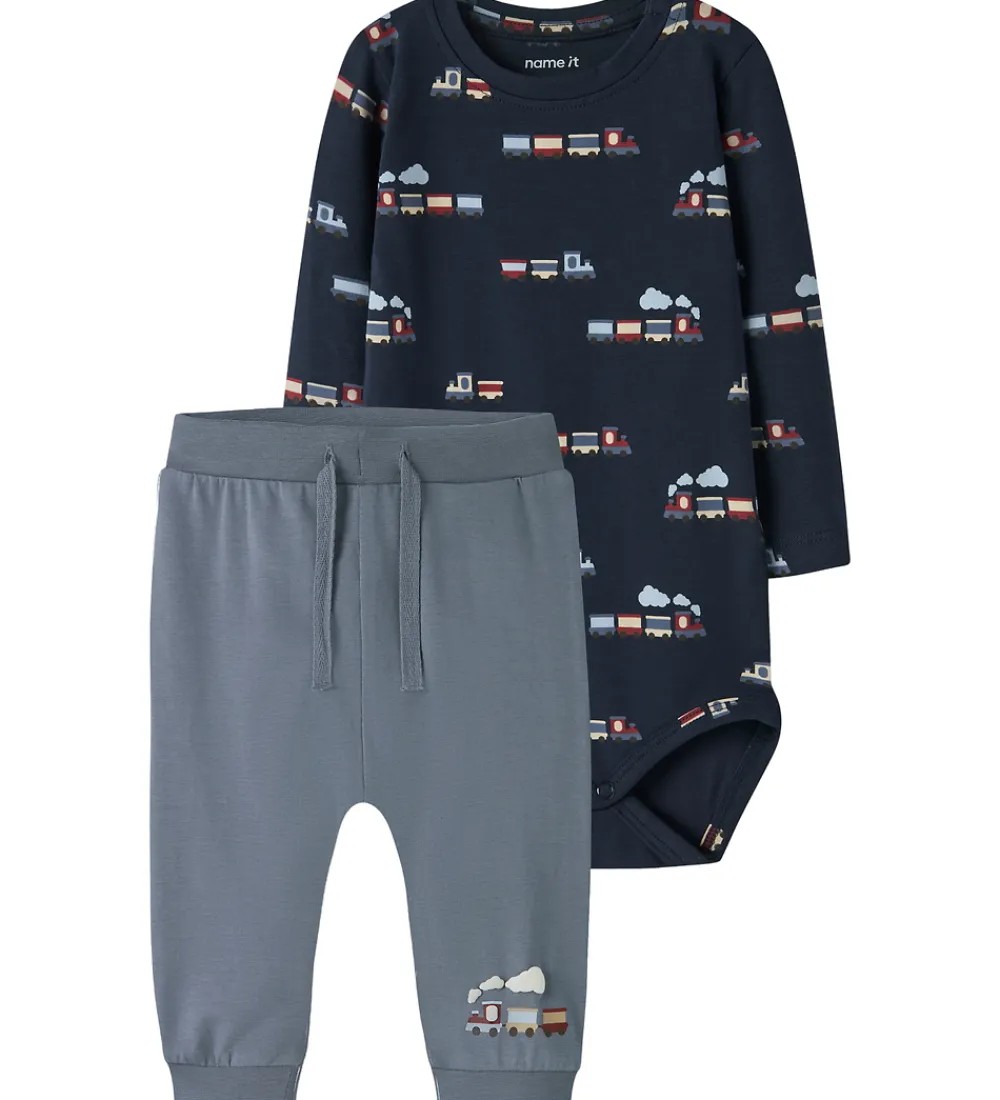 Charmerende Name It sæt bestående af en body og et par bukser i blå nuancer med et mønster af små, farverige tog.