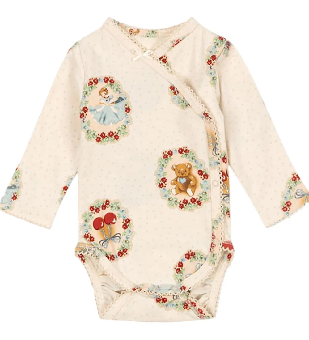 Charmerende Konges Sløjd sæt bestående af en slå-om body og et par leggings. Sættet er i beige dekoreret med et yndigt print af motiver som bamser og kirsebær i farverige blomsterkranse.