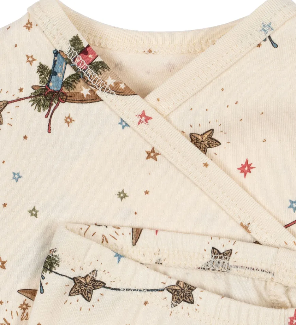 Indbydende Konges Sløjd sæt bestående af en slå-om body og et par leggings. Sættet er i beige med et charmerende motiv af måner og stjerner.