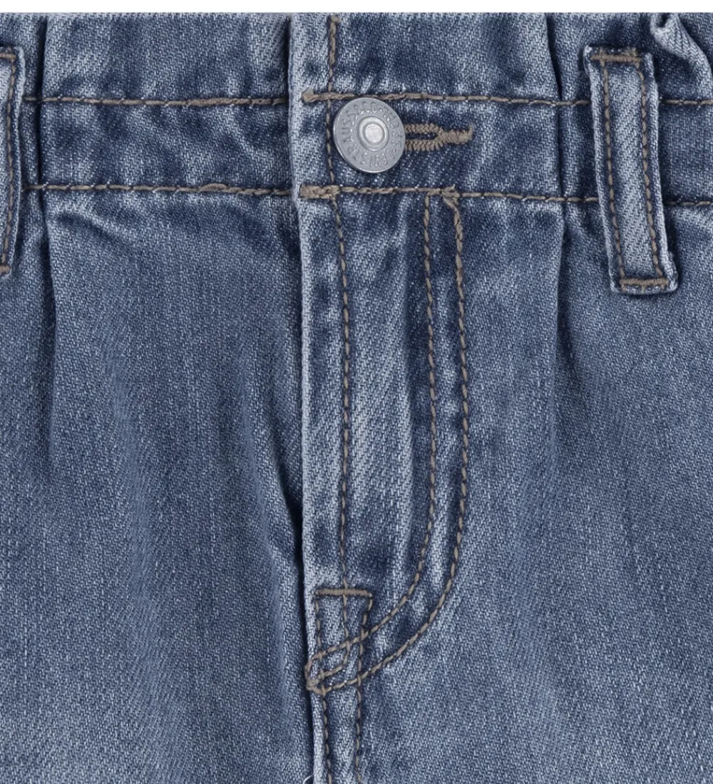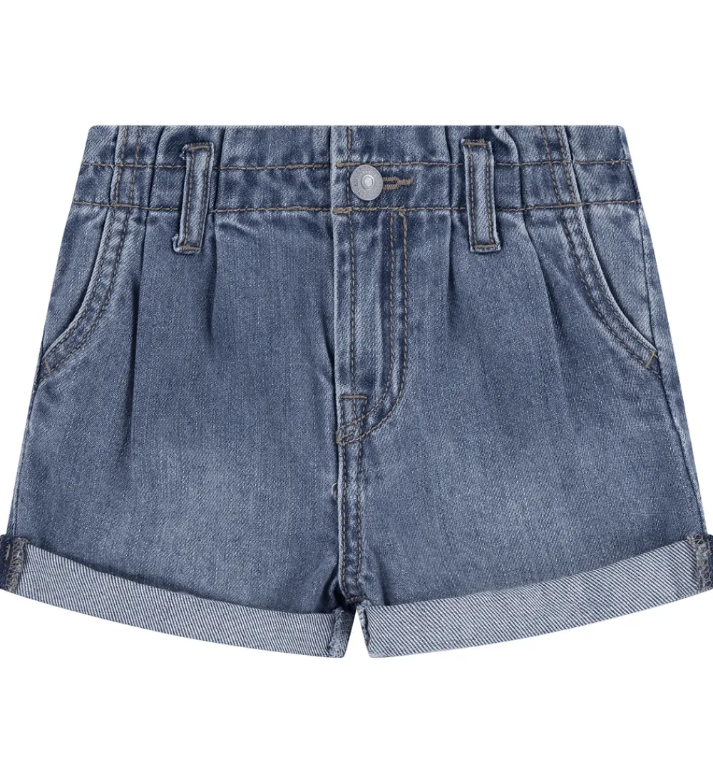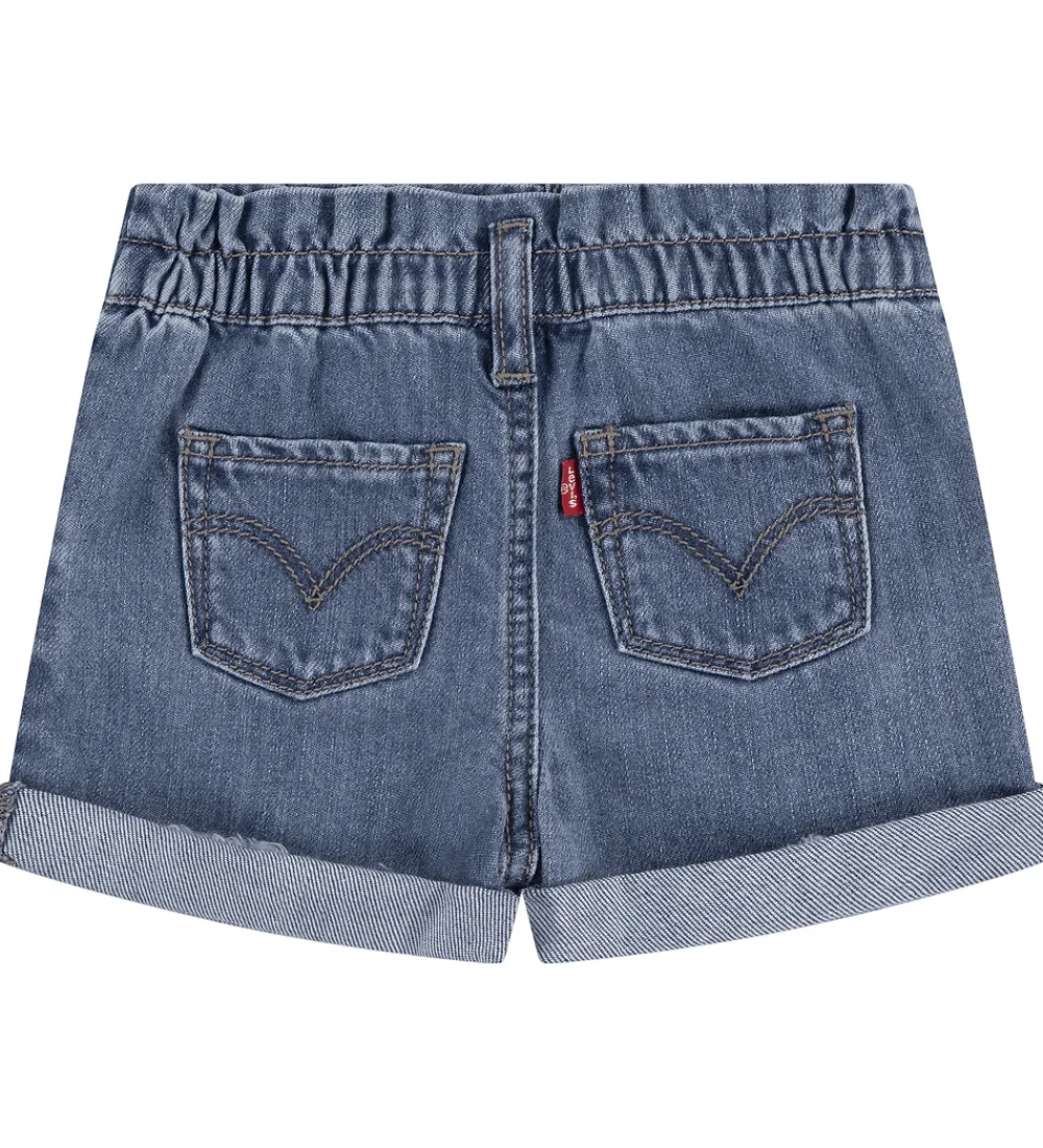 Smarte Levis shorts i en klassisk denimblå farve med brune syninger. Levis shortsene har en elastisk talje som lukkes fortil med en hægte og lynlås. Shortsene har bæltestropper og lommer foran og bagpå. Shortsene har fine læg og opsmøg nederst.