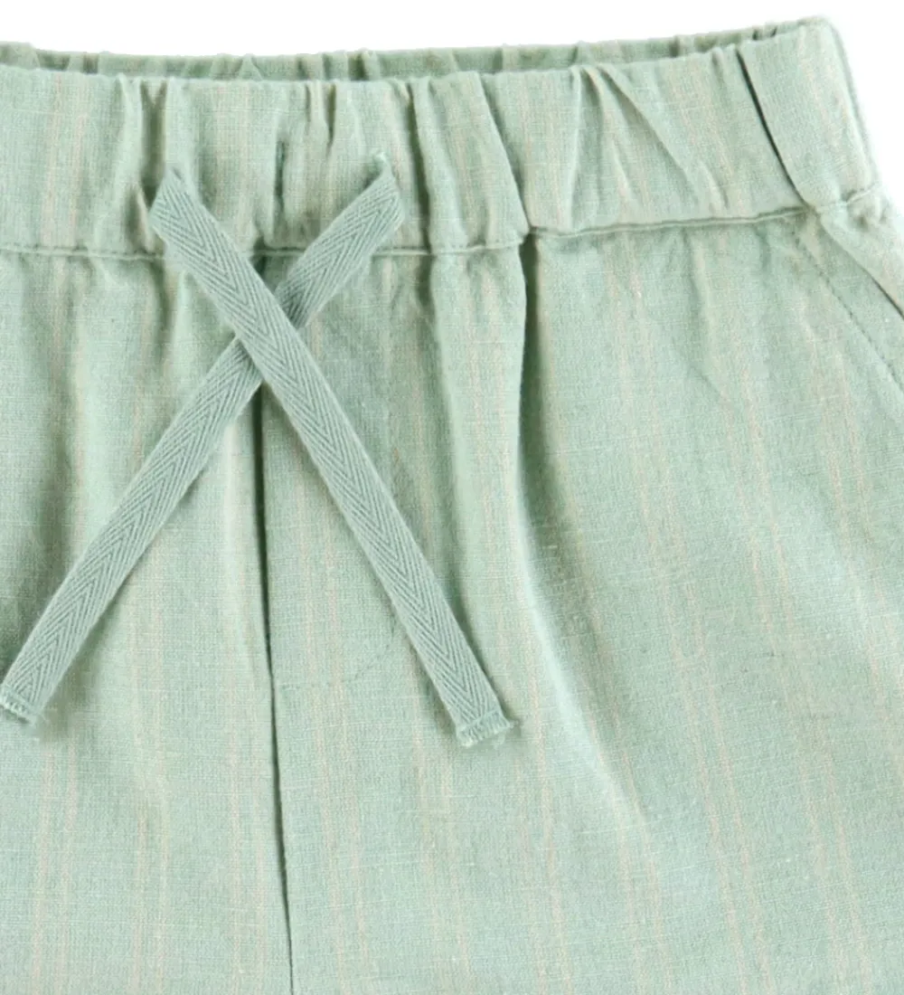 Flotte Name It shorts i lys, støvet grøn med et diskret stribet print i beige. Shortsene har en elastisk talje med dekorative bindebånd fortil. De kan justeres med knapper indvendigt for optimal pasform. Fortil er der en lomme i hver side og bagpå er der smarte baglommer. I benåbningerne er der et fint ombuk.