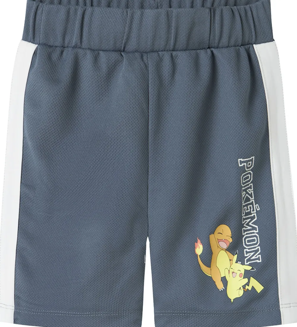 Lækre Name It shorts i støvet blå med Pokémon-print på venstre ben og hvide striber langs ydersiden af benene. Shortene har en bred elastik i taljen, som kan justeres med knapper indvendigt.