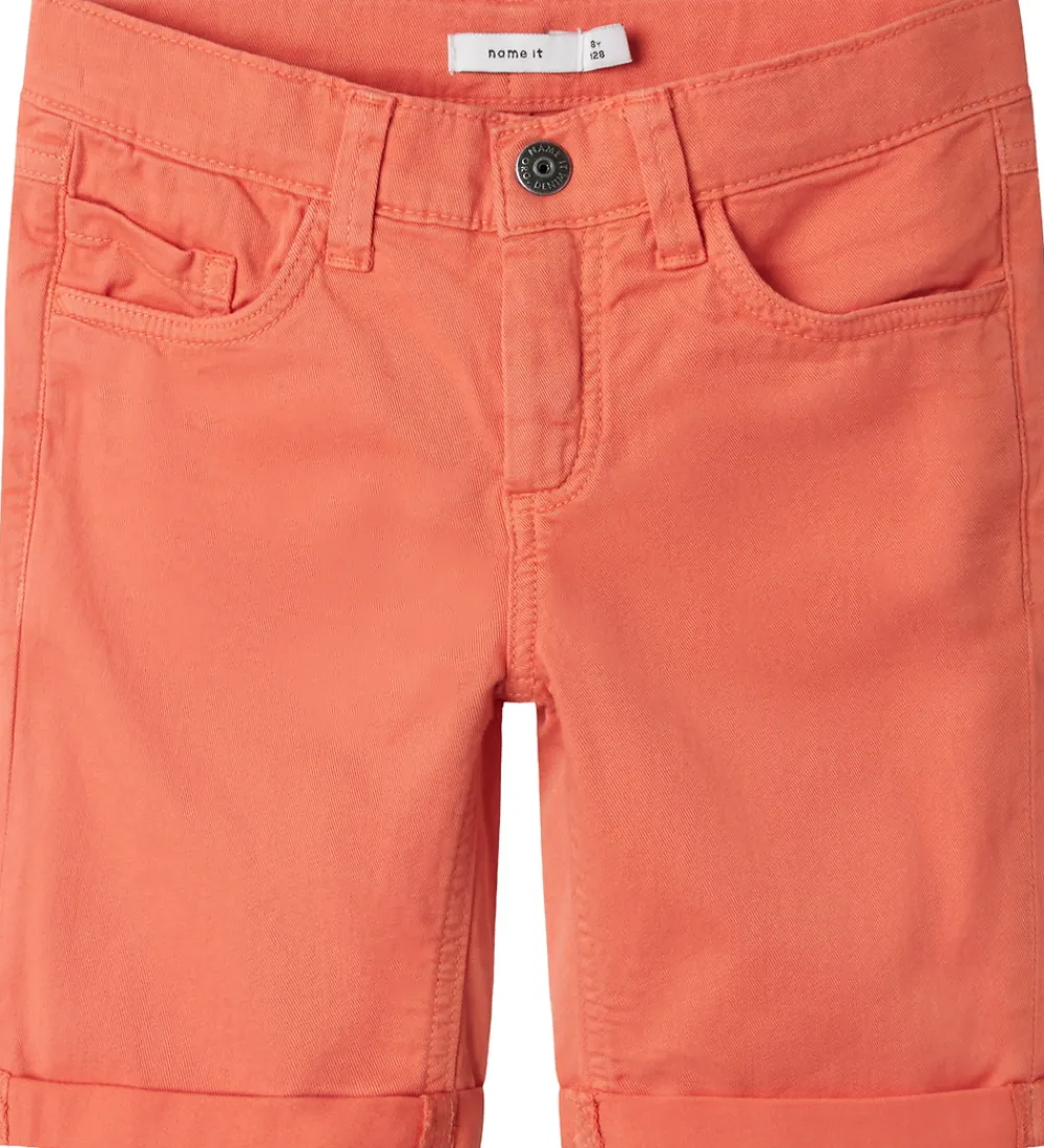 Stilfulde Name It shorts i en frisk, orange farve. Shortsene har en klassisk design med knaplukning og bæltestropper. Taljen justeres indvendigt med knapper. Name It har inkluderet praktiske lommer foran og bagpå samt opsmøgede kanter, der giver et smart look.