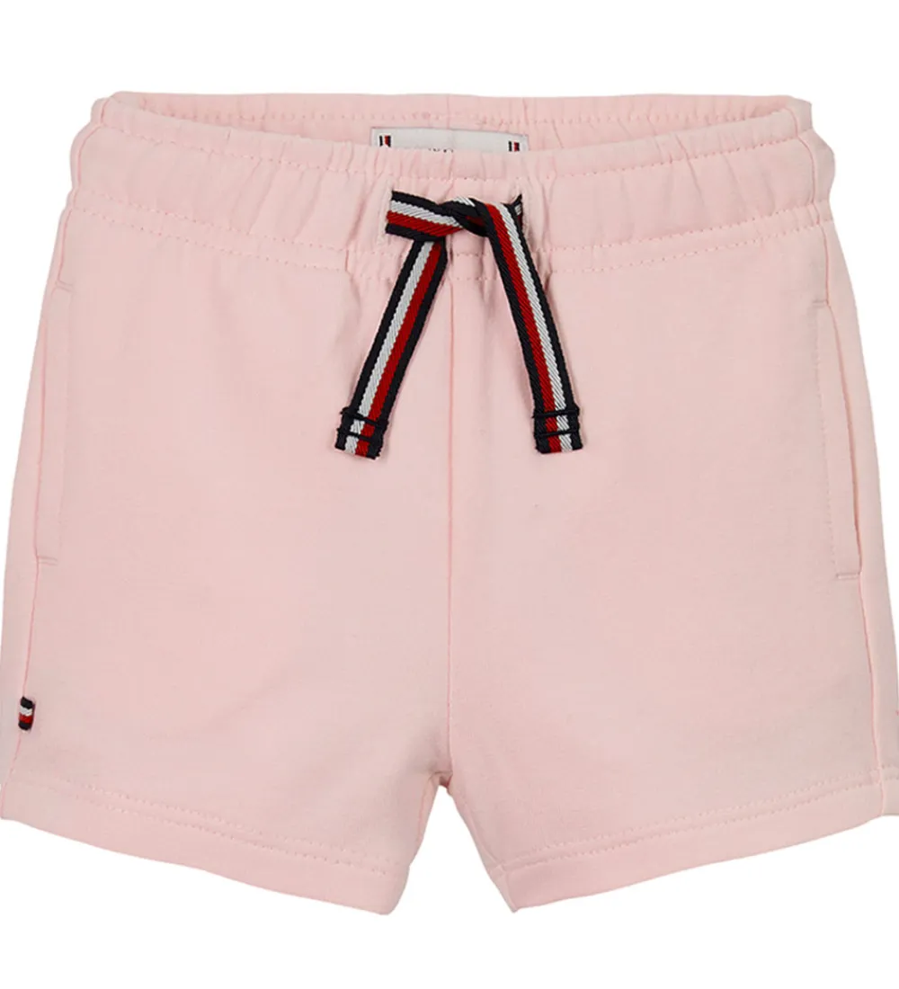 Charmerende Tommy Hilfiger shortssæt i rosa bestående af et t-shirt med hvidt logoprint på fronten og et par shorts. T-shirten har en rund halsudskæring med en smal ribkant og praktiske trykknapper ved venstre skulder. Shortsene har en bred elastik i taljen, som kan justeres med snøre fortil. Øverst er der en lomme i hver side og bagtil er der en lomme i højre side.