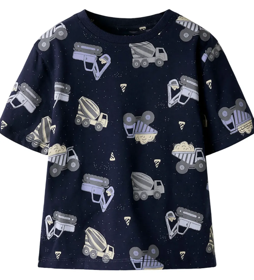 Lækkert Name It shortssæt bestående af et t-shirt og et par shorts. Name It shortsene er i en blød, blå nuance og har en komfortabel elastik i taljen og praktiske snører foran. T-shirten er i navyblå med et spændende transportmiddel-print.