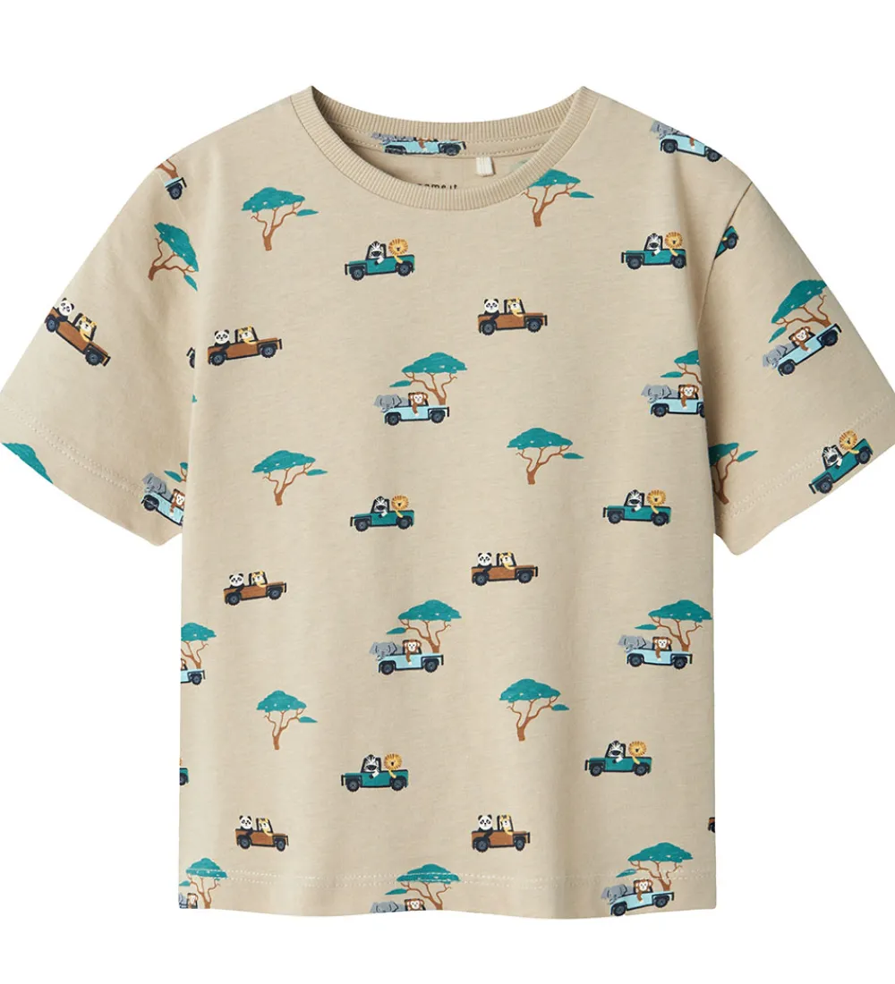 Smart Name It shortssæt i beige med et alloverprint af safaridyr i safaribiler. Shortsættet består af en t-shirt med korte ærmer og et par shorts med en bred elastisk talje og dekorative bindebånd fortil. Shortene kan justeres med knapper indvendigt og har praktiske sidelommer.