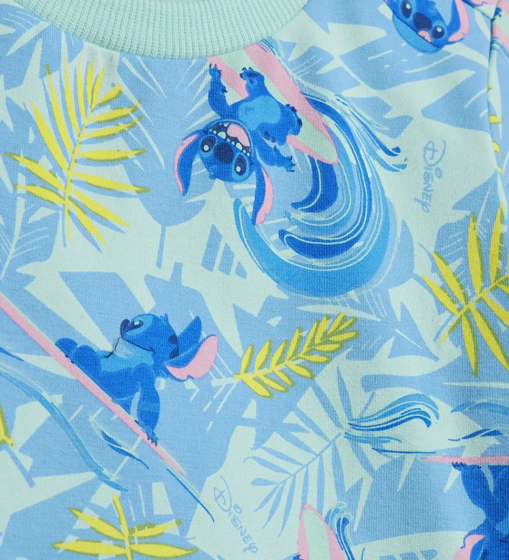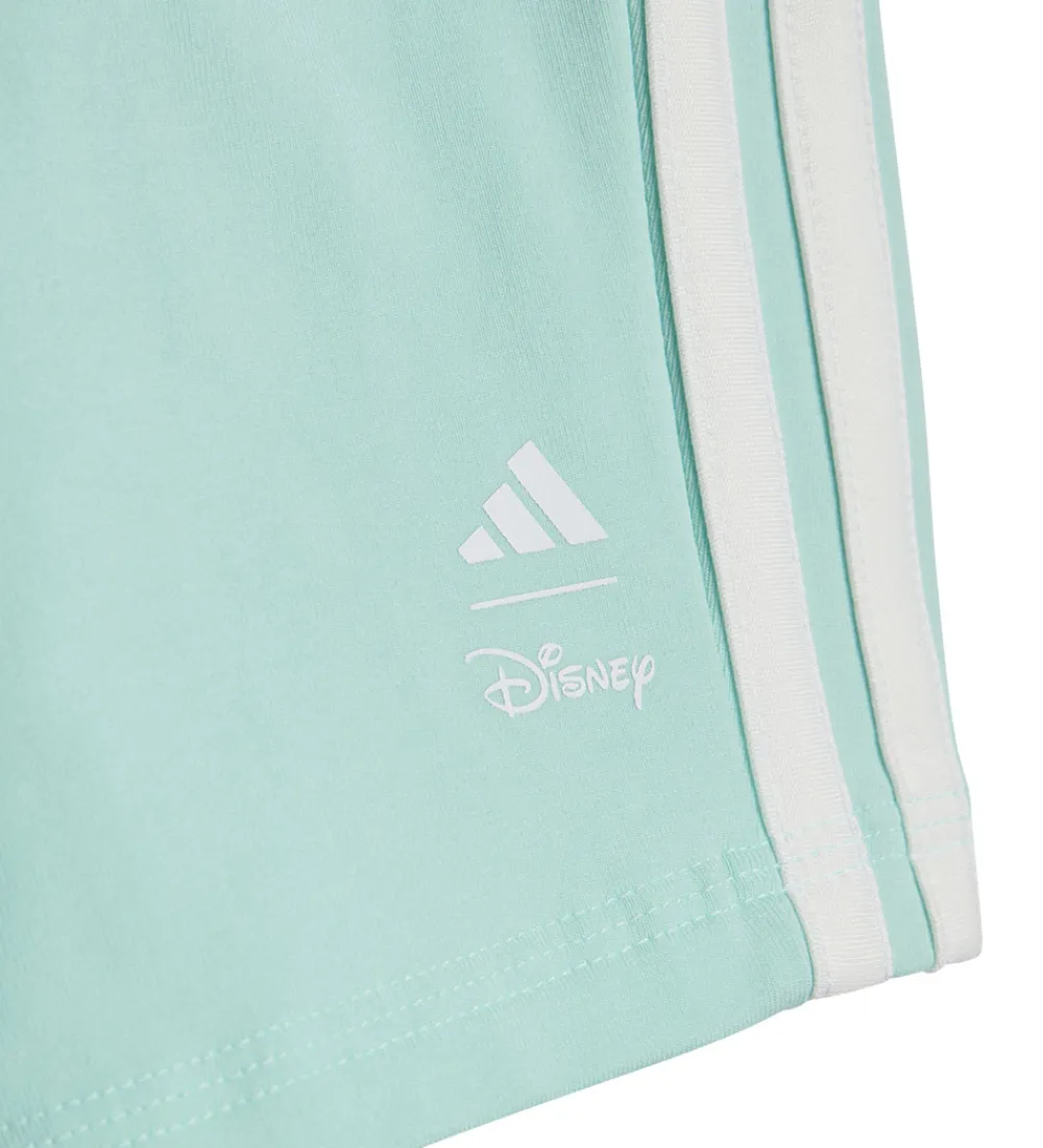 Smart adidas Performance sæt, der består af et par shorts og en t-shirt. Sættet er mintgrønt, og t-shirten har en alloverprint af Stitch der surfer i blå nuancer.