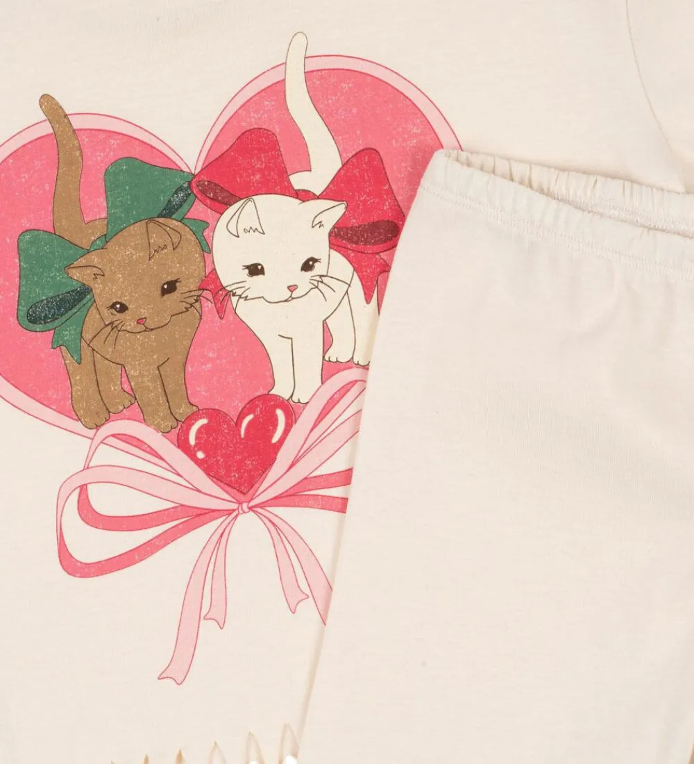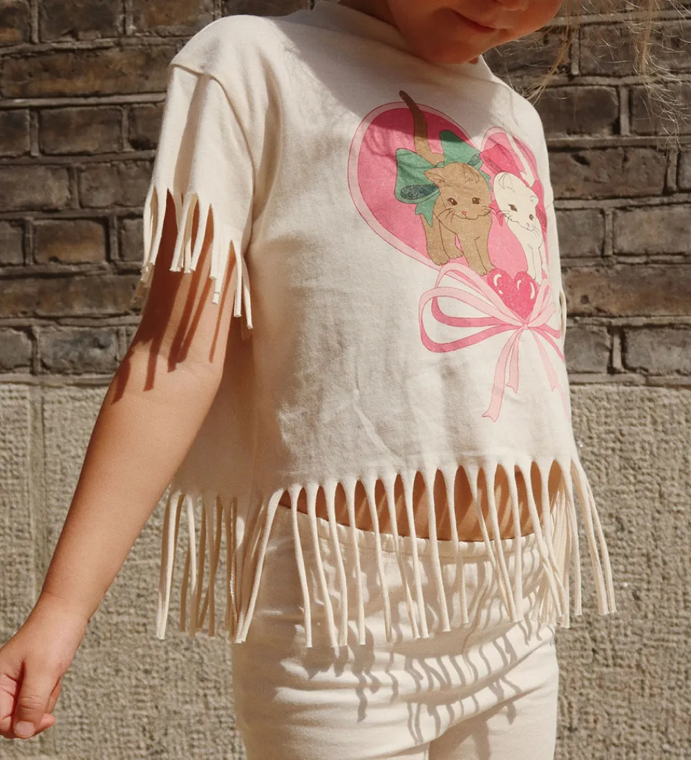 T-shirten har et sødt katteprint og har frynser langs kanten, hvilket tilføjer et unikt twist til designet. Cykelshortsene har en tætsiddende pasform med elastik i livet.