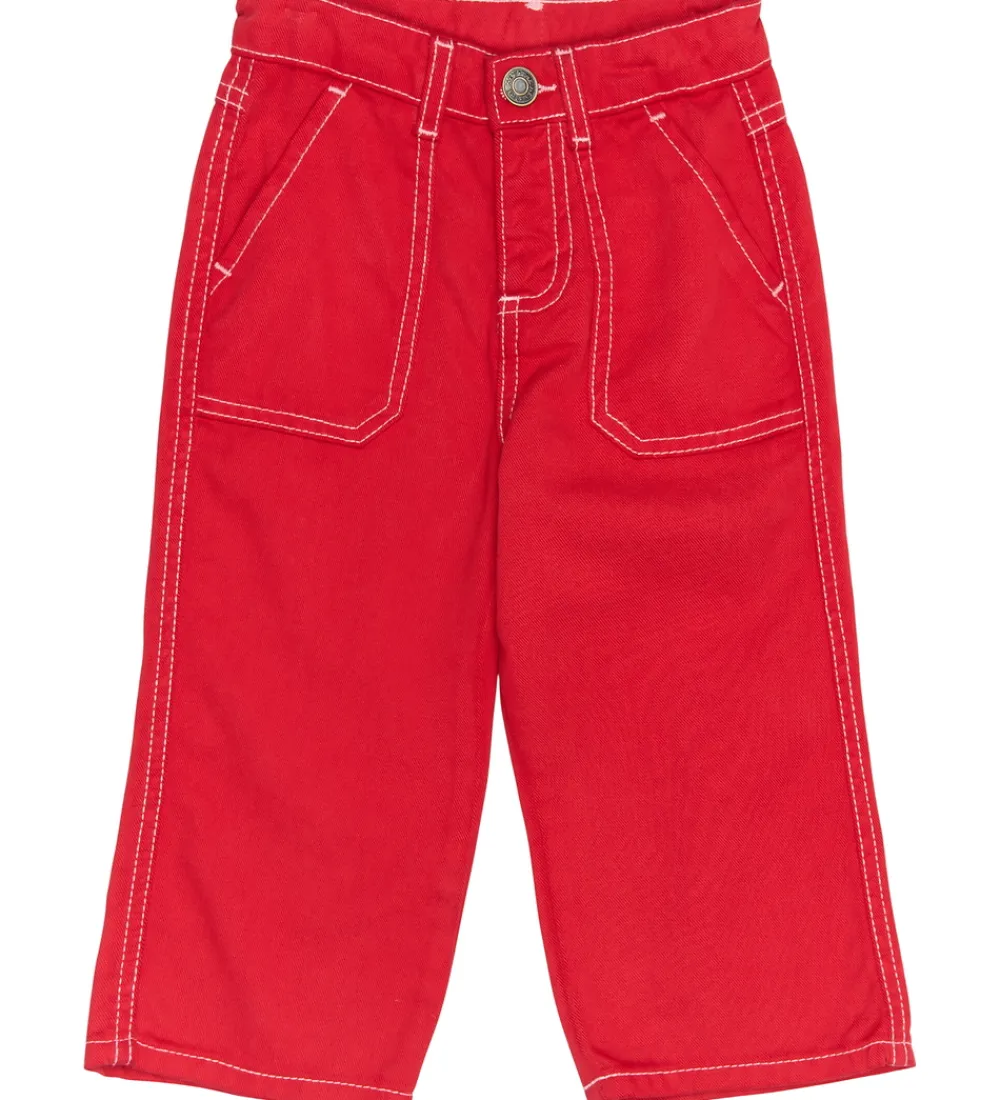 Moderne The New Siblings jeans i rød denim med hvide syninger. The New Siblings jeansene har en elastisk talje, som kan justeres med knapper indvendigt. De lukkes fortil med en trykknap og lynlås. Jeansene har bæltestropper og lommer på for- og bagside. De har en afsalppet pasform me vide ben.