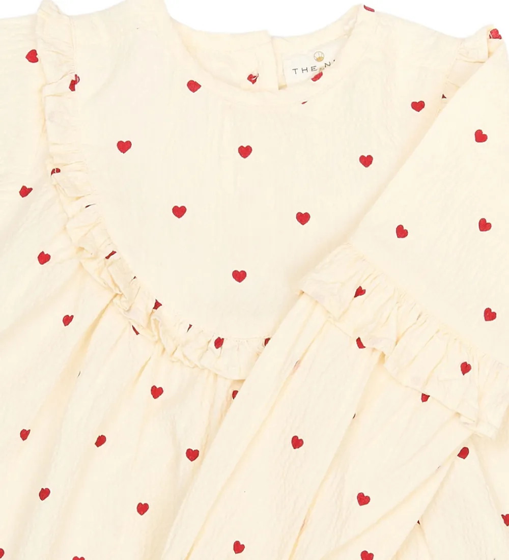 Enkel The New Siblings kjole i hvid med små, røde hjerter. The New Siblings kjolen har lange ærmer og en fin flæsekant ved brystet. Mønsteret skaber et charmerende og iøjnefaldende udtryk. Kjolens struktur er let og luftig, hvilket giver et elegant fald.