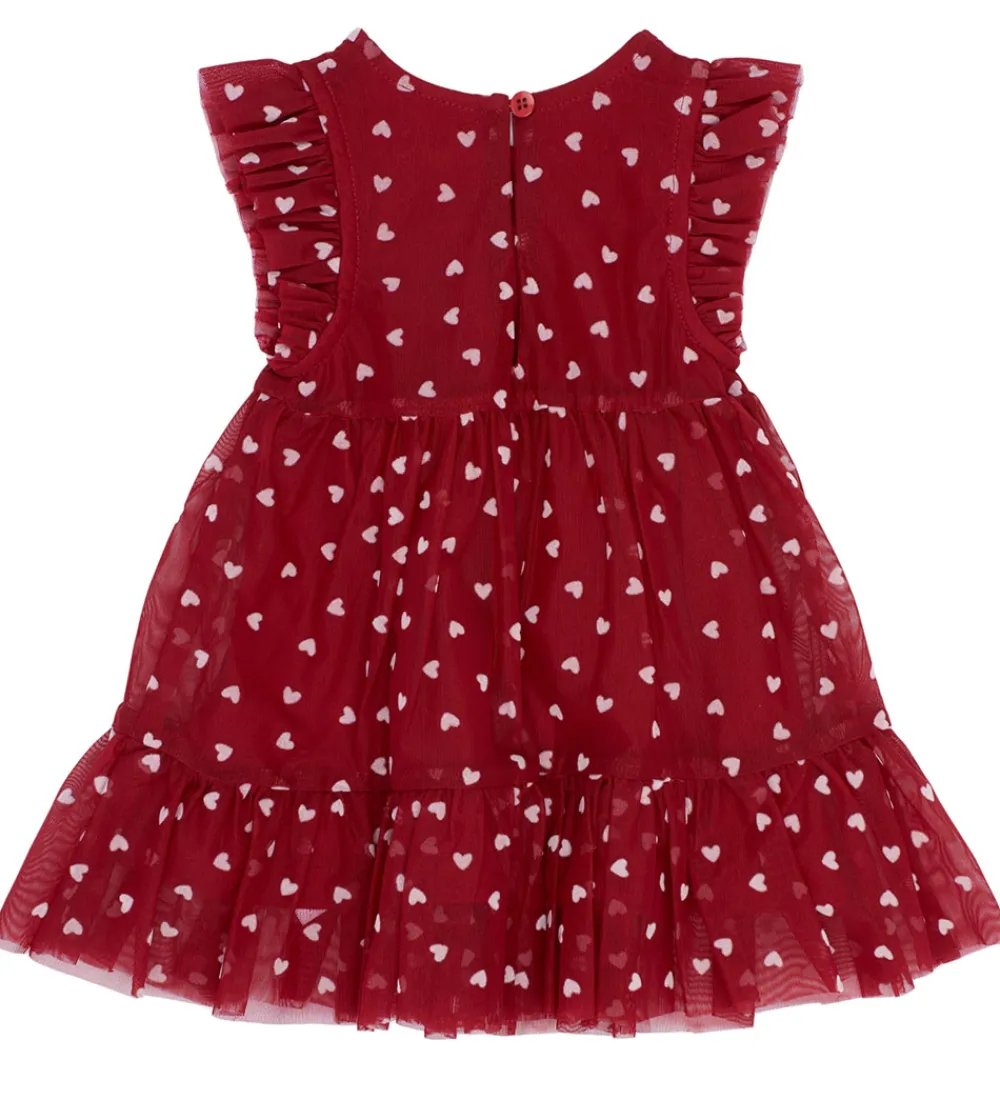 Elegant The New Siblings tylkjole i dyb, rød farve med rosafarvede hjerter.