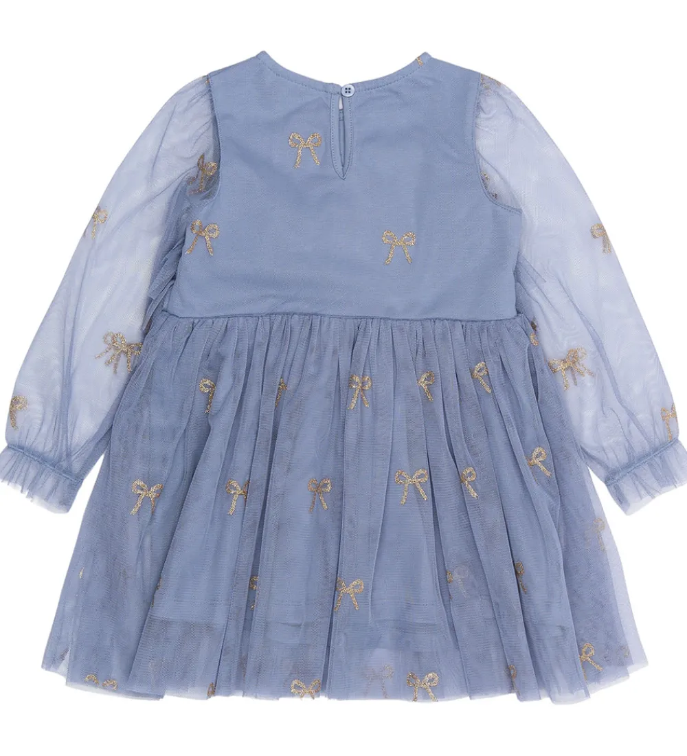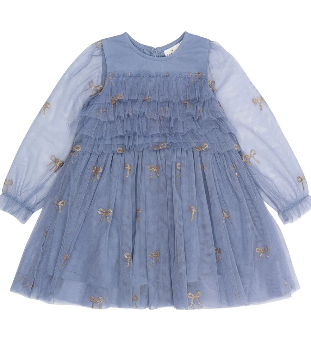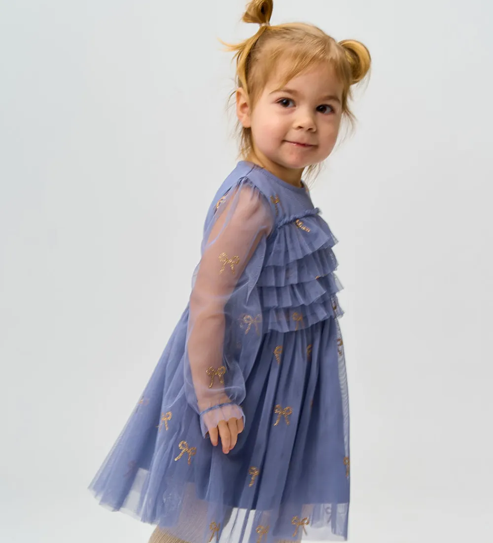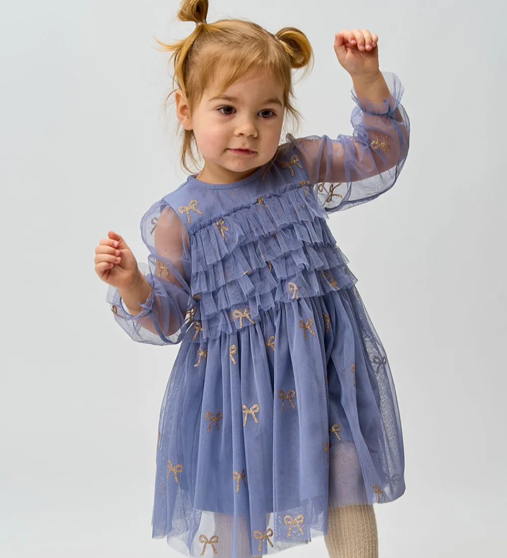 Tylkjolen er prydet med små, gyldne sløjfer og har flere lag af tylflæser på overdelen. The New Siblings tylkjolen har en rund halsudskæring, der tilføjer et klassisk touch.