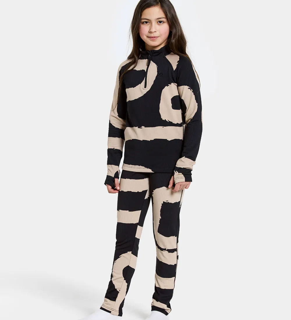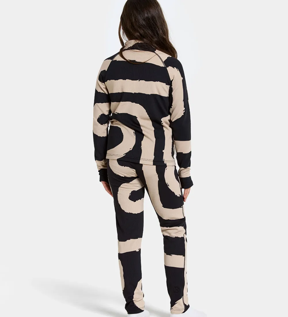 Lækkert Didriksons skiundertøj i sort med et beigefarvet mønster af brede, snoede striber. Sættet består af en bluse med lange ærmer og et par bukser.