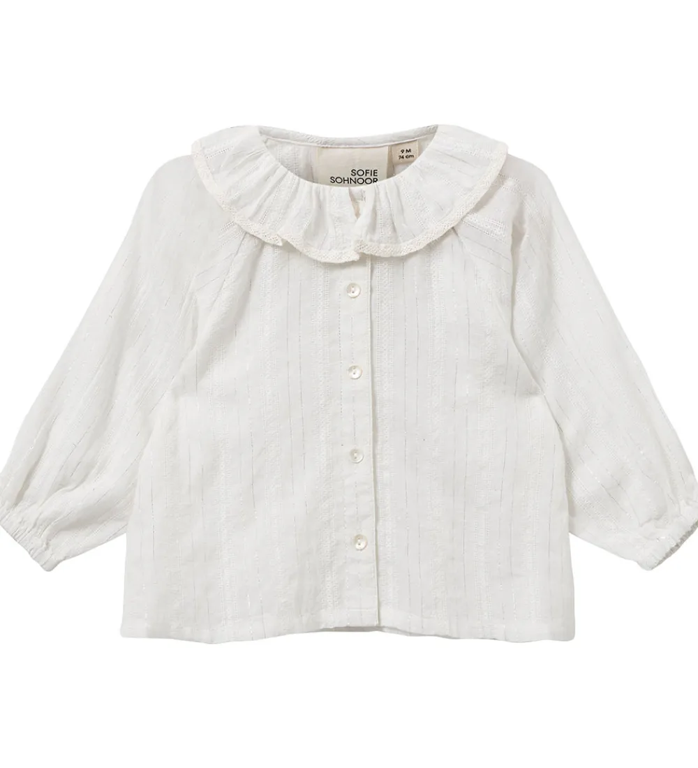 Lækker Sofie Schnoor skjorte i hvid med smalle, sølvfarvede striber og med fine detaljer som en volangkrave. Skjorten har lange ærmer og knaplukning, hvilket giver et sødt og klassisk udtryk til dit barns garderobe.