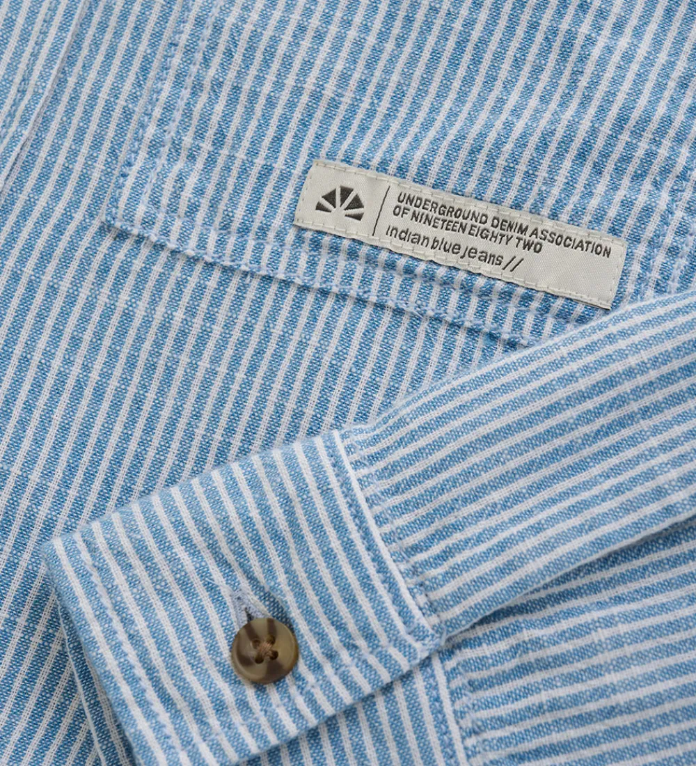 Lækker Indian Blue Jeans skjorte med smalle, lodrette striber i blå og hvid. Skjorten har lange ærmer og to brystlommer, hvilket giver et stilfuldt og praktisk udtryk. Skjorten åbnes med brune knapper.