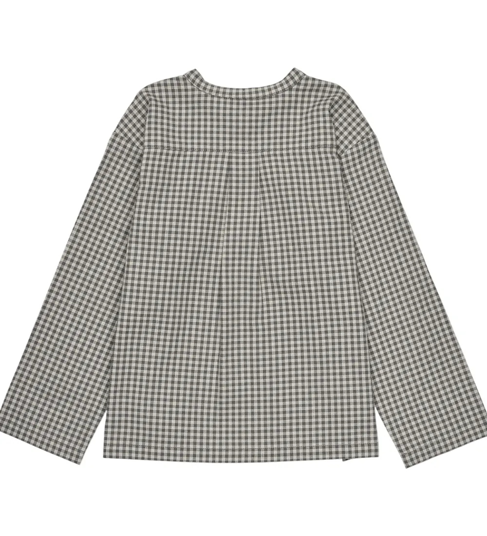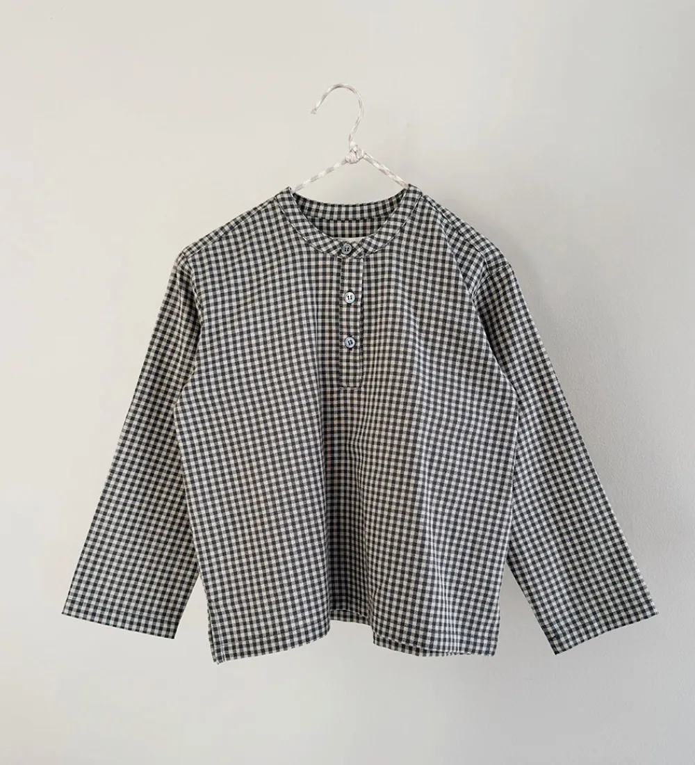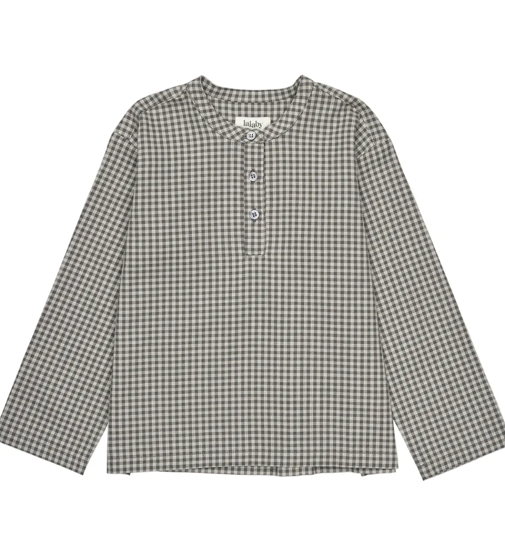 Flot Lalaby skjorte med et klassisk, ternet mønster i gråblå og hvide nuancer. Skjorten har lange ærmer og en rund halsudskæring med tre knapper ned foran, der giver et stilrent udtryk. Pasformen er løs hvilket giver god bevægelsesfrihed.