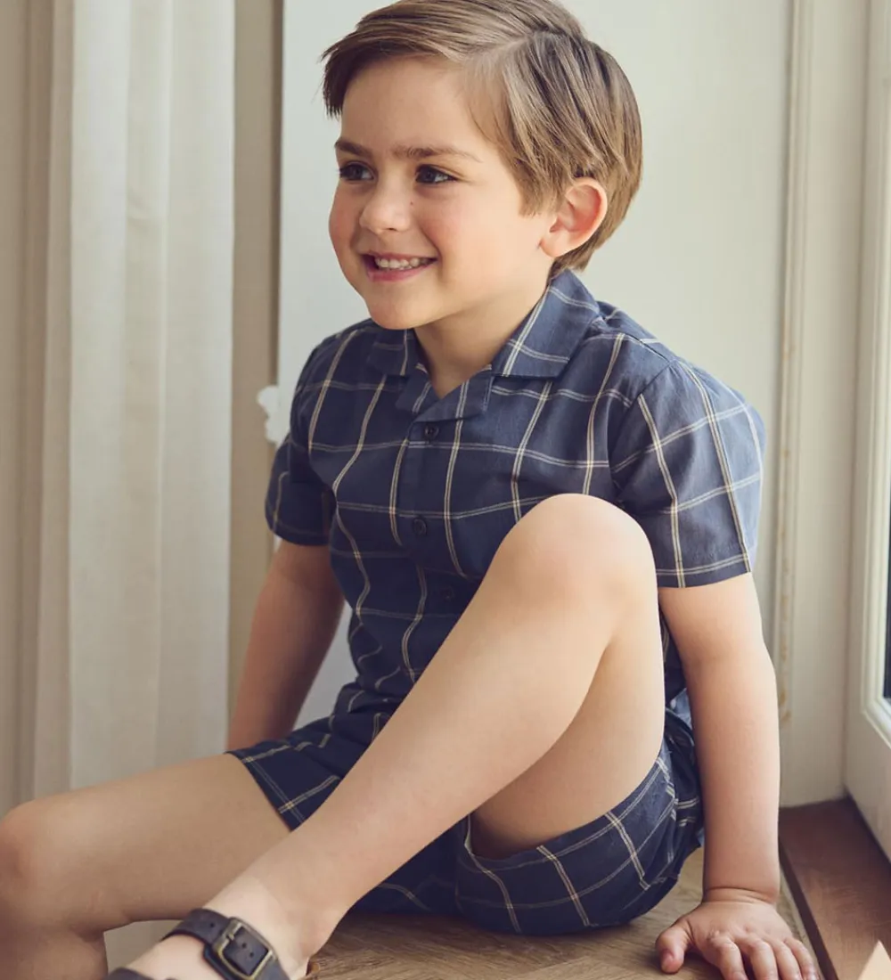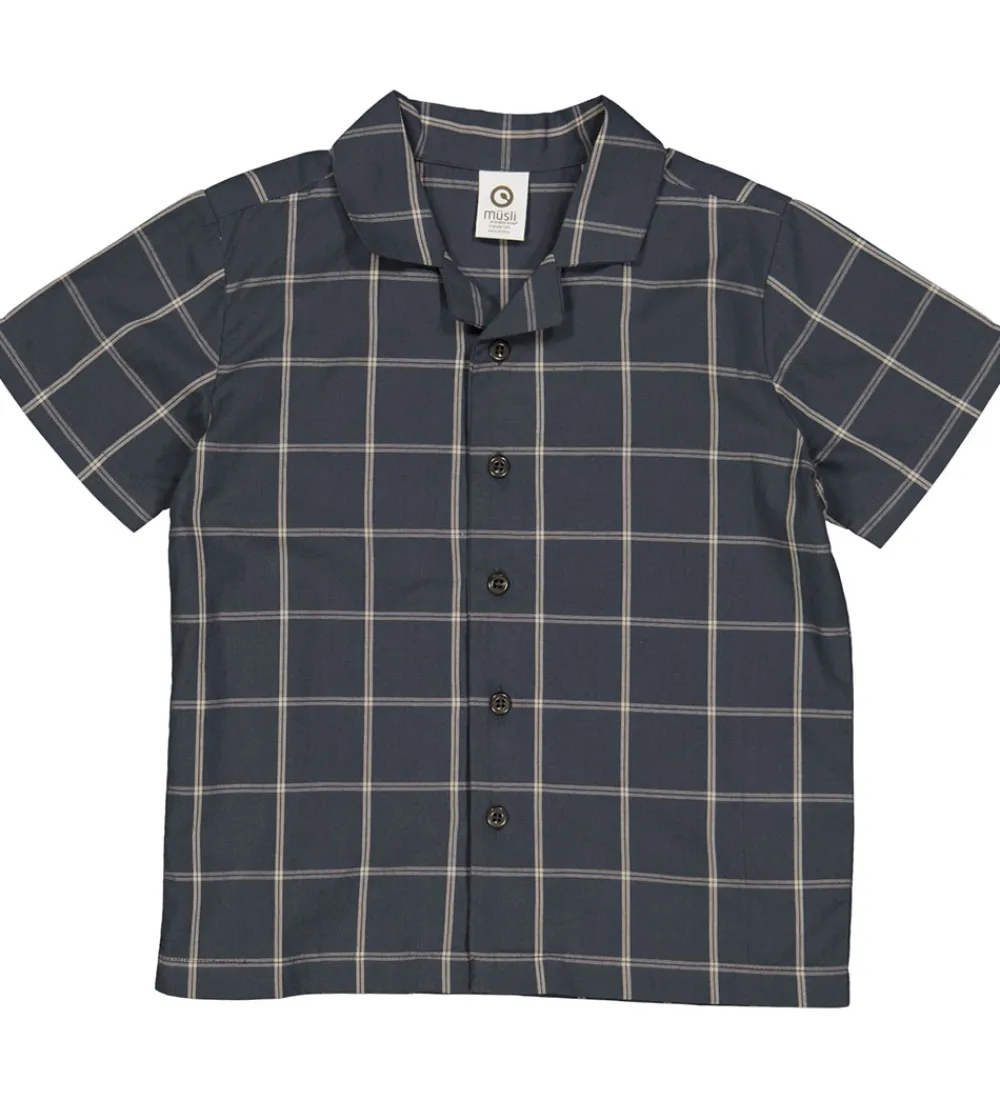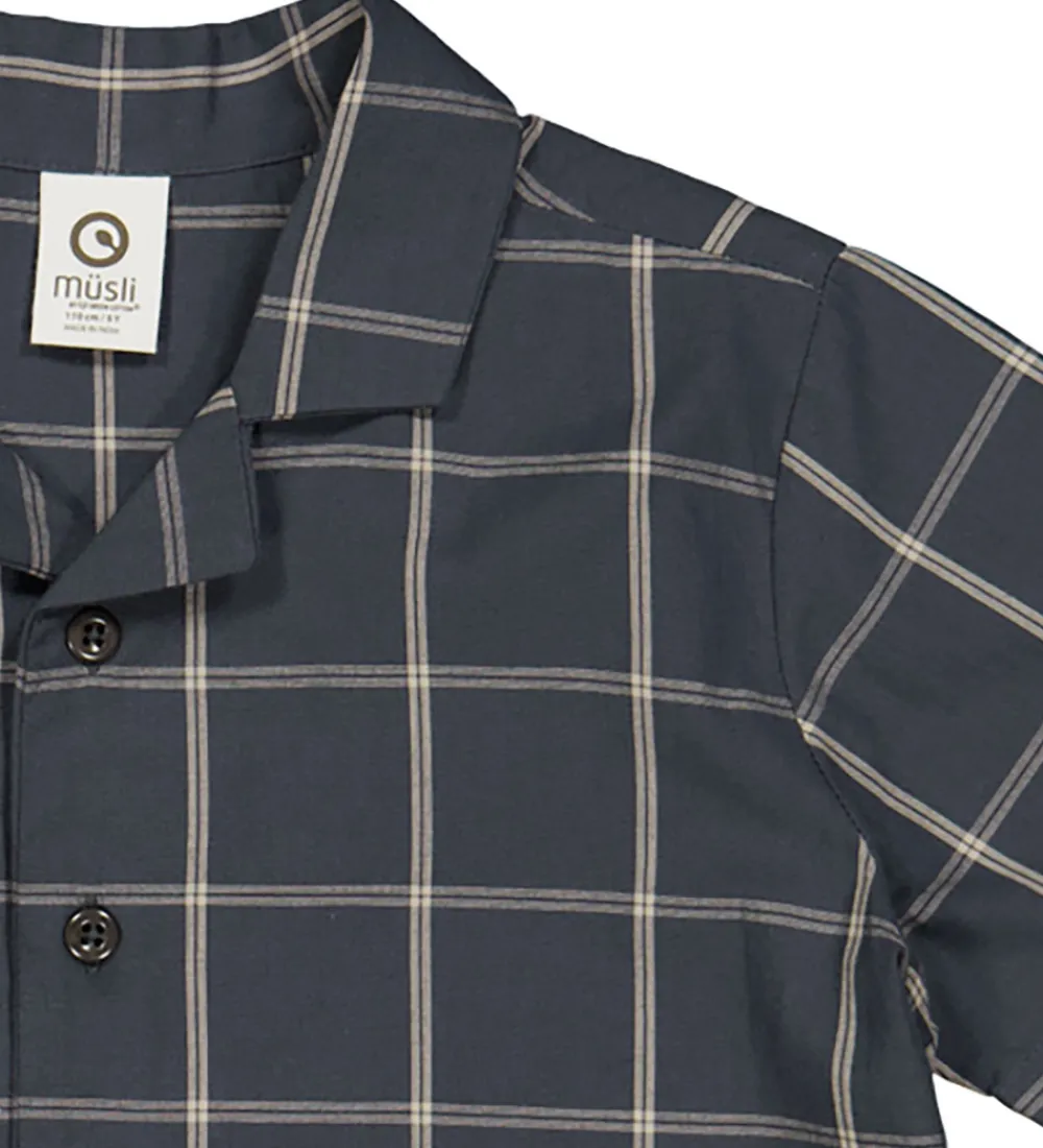 Smart Müsli skjorte i en dyb blå nuance med et klassisk ternet mønster. Skjorten har korte ærmer, en flot krave og knaplukning foran, hvilket giver et casual og komfortabelt udtryk.