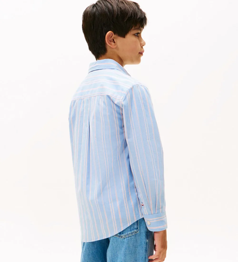 Stilfuld Tommy Hilfiger skjorte i lyseblå med smalle, lodrette striber i rød og hvid. Skjorten har en klassisk krave og lange ærmer med brede kanter og hvide knapper. Skjorten er lavet i en let, fastvævet kvalitet.