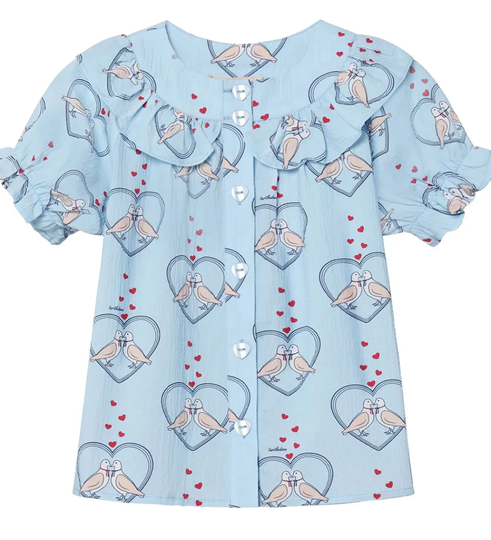 Skøn Fliink skjorte i lyseblå med et sødt print af turdeltuer og hjerter. Skjorten har en rund halsudskæring med en bred flæsekant og gennemgående knapper fortil. Den har korte ærmer med en elastik nederst, som giver en flæseafslutning. Skjorten er fremstillet i en let kvalitet med en let krøllet og strækbar kvalitet.