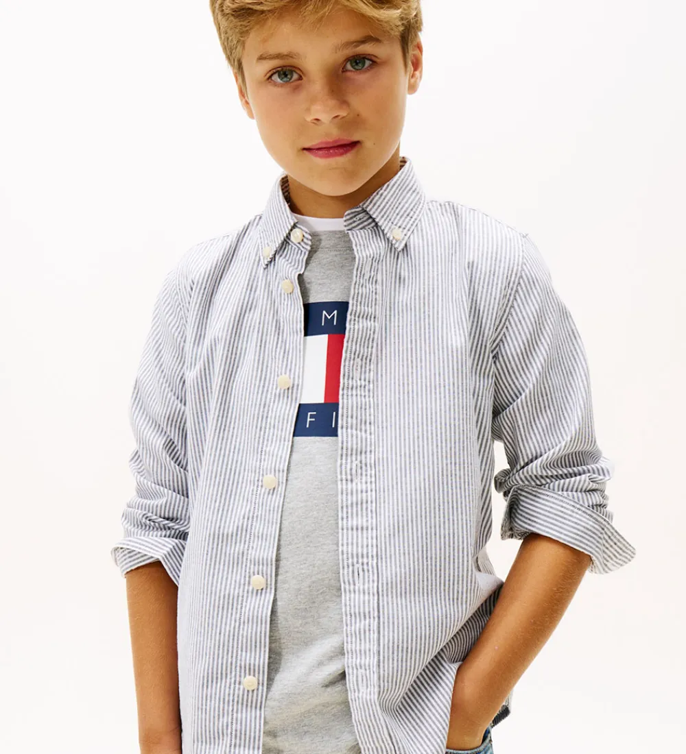 Stilfuld Tommy Hilfiger skjorte i stribet hvid og navyblå. Skjorten har en klassisk krave og knapper foran. Den har lange ærmer med knapper ved håndleddene.