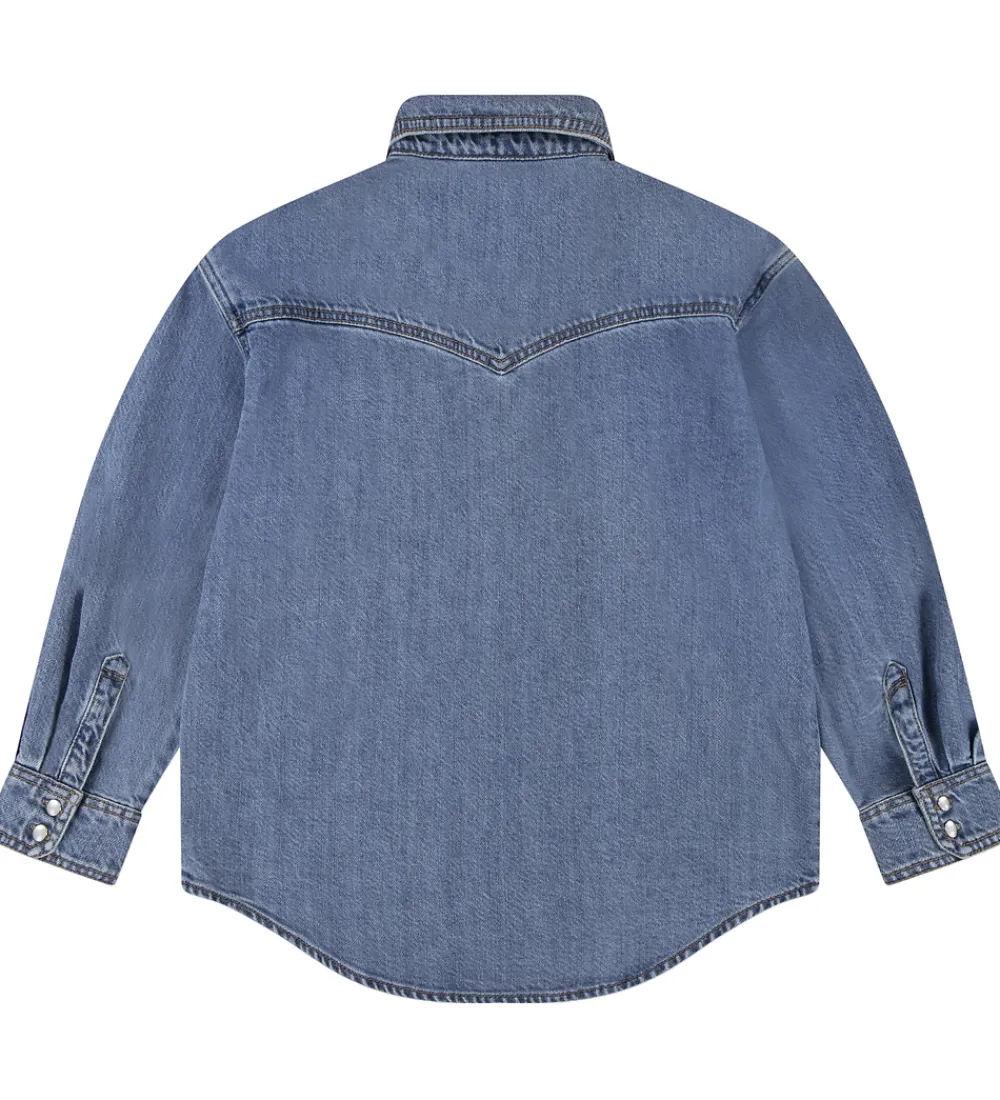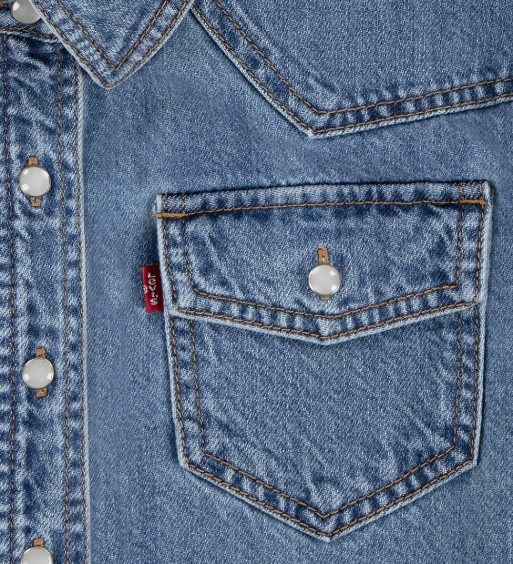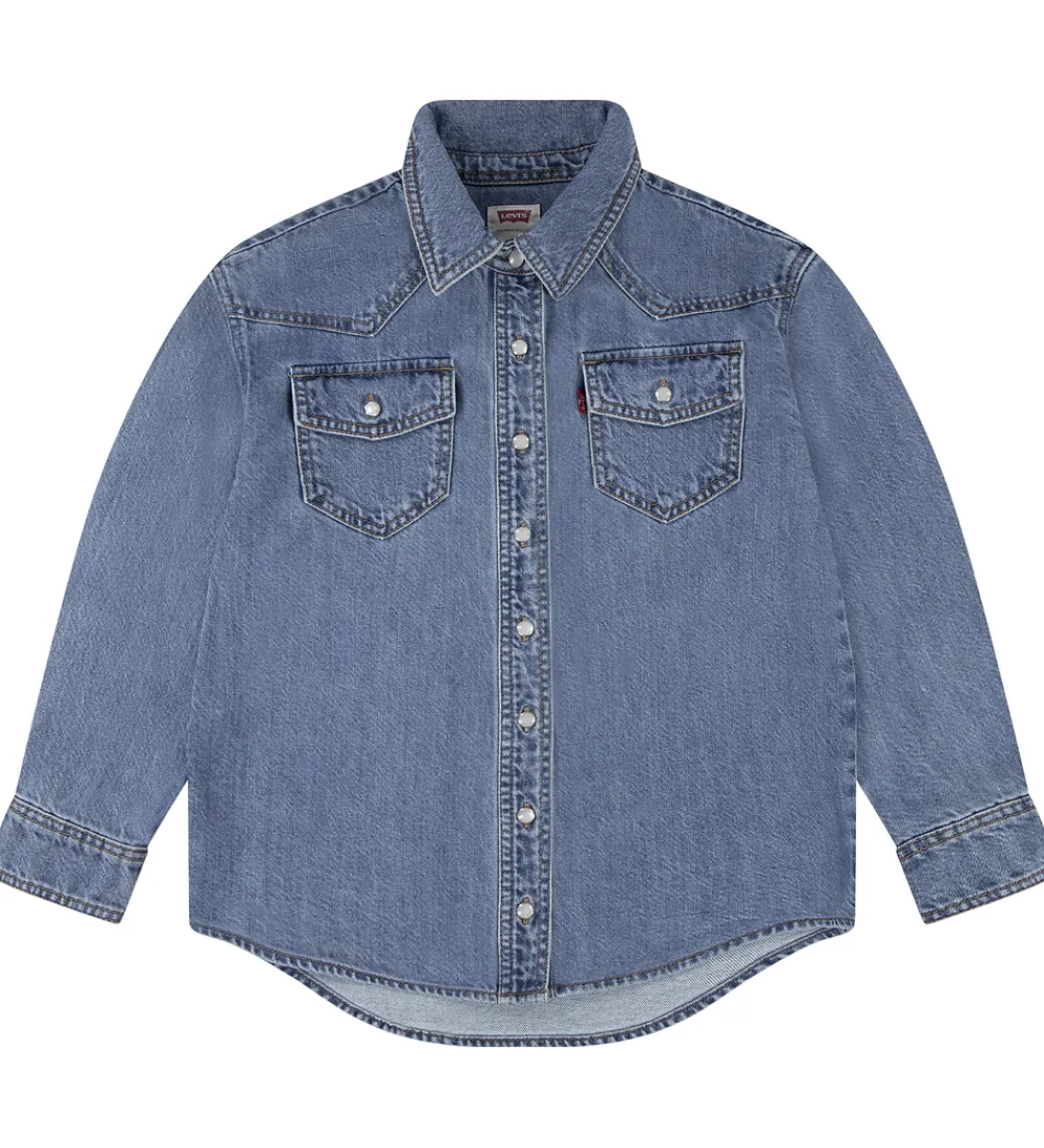 Klassisk Levis skjorte i blå denim med brune syninger og hvide knapper. Skjorten har en klasssisk krave og to brystlommer. Den lukkes fortil med gennemgående knapper.