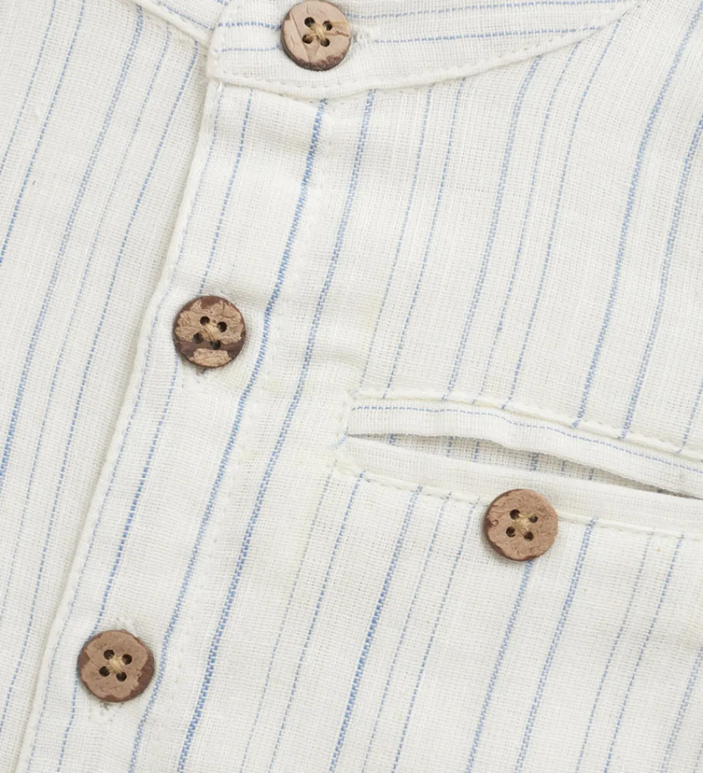 Stilfuld En Fant skjorte i hvid med smalle, blå striber. Skjorten har en fin kinakrave og brune, gennemgående knapper fortil. Skjorten har lange ærmer og en lille brystlomme. Den er fremstillet i en blød og let bomuldskvalitet.