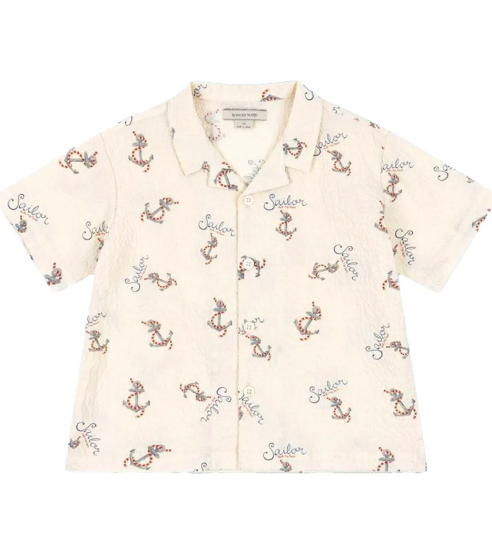 Skøn Konges Sløjd skjorte i bæk og bølge med korte ærmer i en lys, beige nuance med et fint anker- og sømandsprint. Skjorten er perfekt til små eventyrere, der søger komfort og stil.