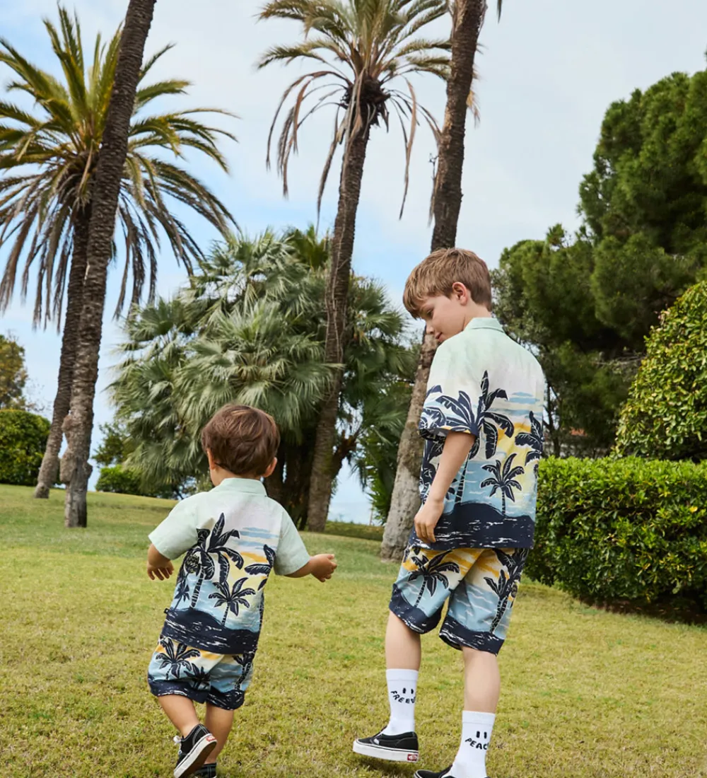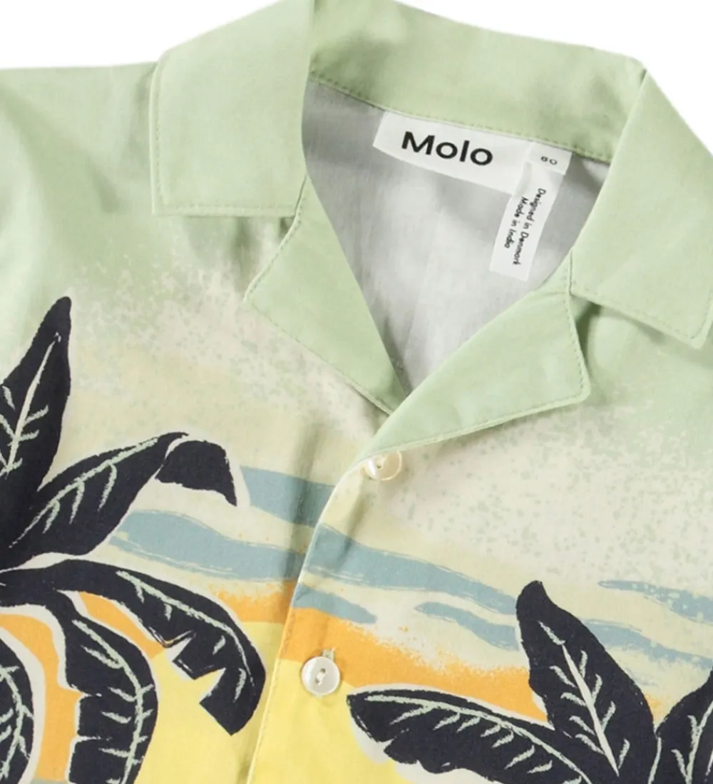 Skøn Molo skjorte med korte ærmer i en lys grøn nuance og med et stemningsfyldt palmeprint.