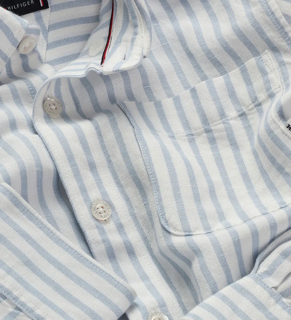 Klassisk Tommy Hilfiger skjorte med lange ærmer i en elegant lyseblå med hvide striber. Skjorten har en praktisk brystlomme og en diskret knaplukning. Tommy Hilfiger-logoet er smukt placeret ved ærmet.