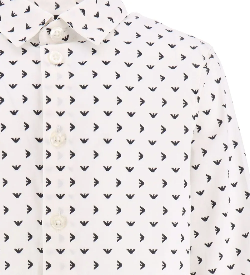 Smart Emporio Armani skjorte i hvid med et allover print af små, sorte logoer.