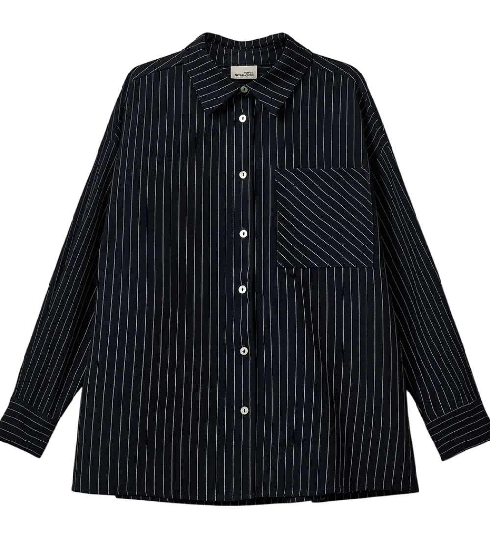 Stilfuld Sofie Schnoor skjorte med lange ærmer og en klassisk krave. Skjorten har et tidløst design med smalle hvide striber på en navy baggrund. Den er udstyret med en enkelt brystlomme, der tilføjer en ekstra detalje til det enkle udtryk. Skjorten har en løs pasform, hvilket ses i den afslappede silhuet.
