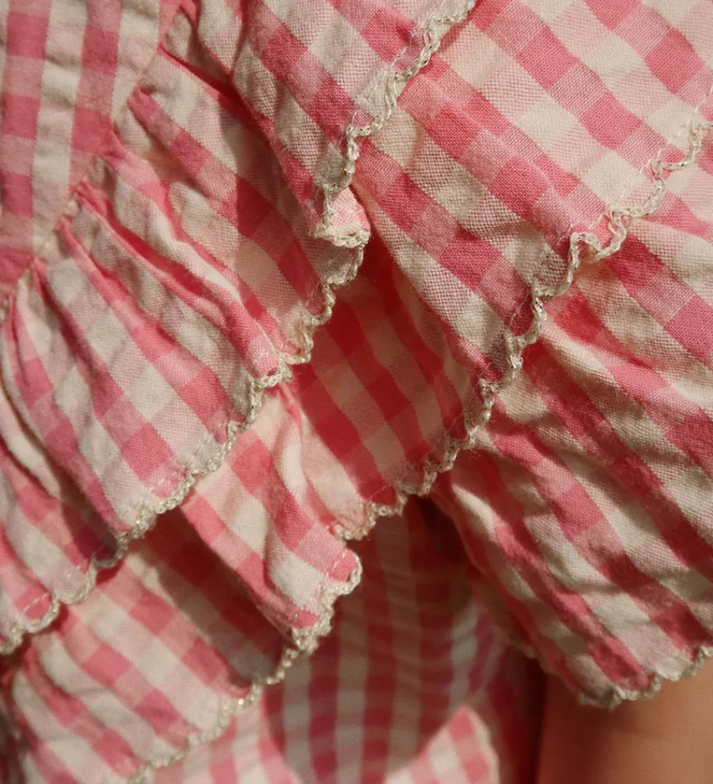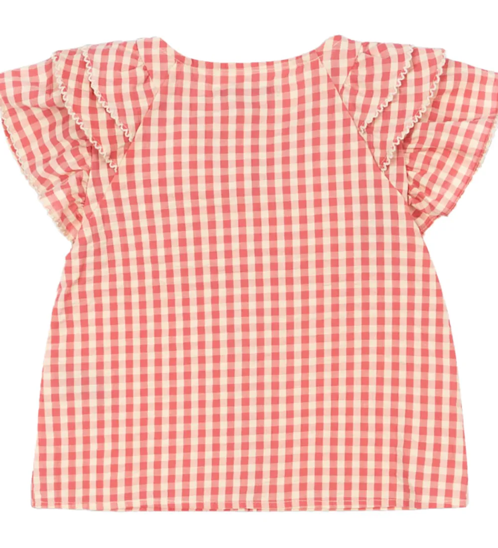 Skøn Konges Sløjd skjorte med korte ærmer i rosa og beige med ternet mønster og en dekorativ flæsekant fortil. Skjorten har gennemgående knapper fortil og er fremstillet i en let bomuldskvalitet.