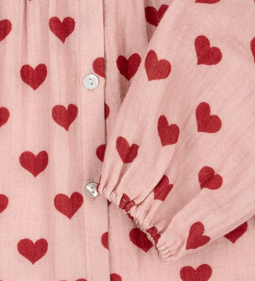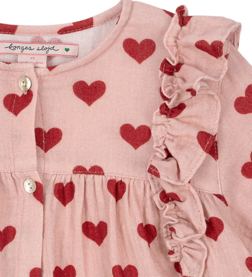Charmerende Konges Sløjd skjorte med musselinstruktur og lange ærmer i en blød, rosa nuance med et print af røde hjerter. Skjorten har fine flæsedetaljer langs brystet og knaplukning foran. Konges Sløjd sikrer en behagelig pasform, der udstråler en sød stil.