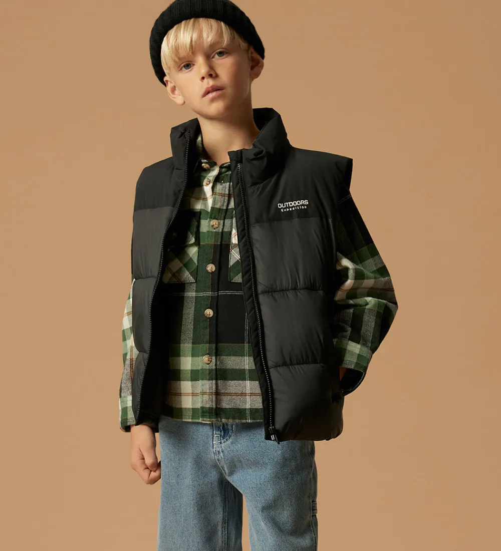 Stilfuld Name It skjorte i kraftig, blød bomuldskvalitet med ternet mønster i sort, grøn, brun og hvid. Skjorten har en klassisk krave, lange ærmer og praktiske knapper langs fronten. Den er forsynet med to brystlommer med knaplukning.