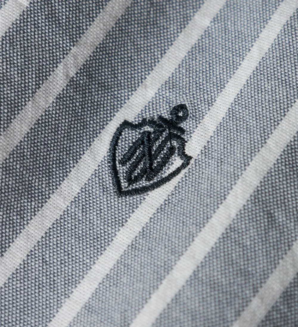 Skjorten har en traditionel krave samt knaplukning ned langs fronten. På brystet findes et diskret, broderet logo, der tilføjer et ekstra stilfuldt element til designet.