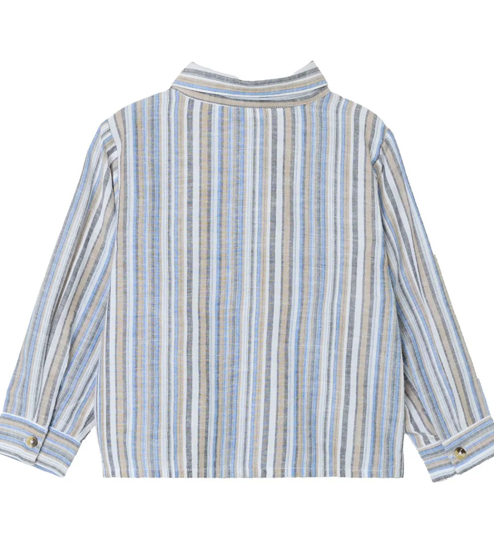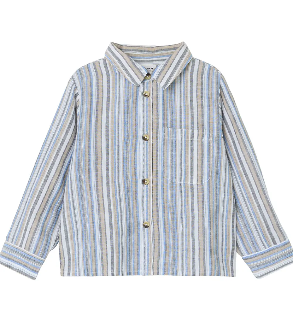 Smuk Name It skjorte med lange ærmer i en klassisk blå, grå, hvid og beige stribemønster. Skjorten har en praktisk brystlomme og knaplukning foran, hvilket gør den både stilfuld og funktionel.