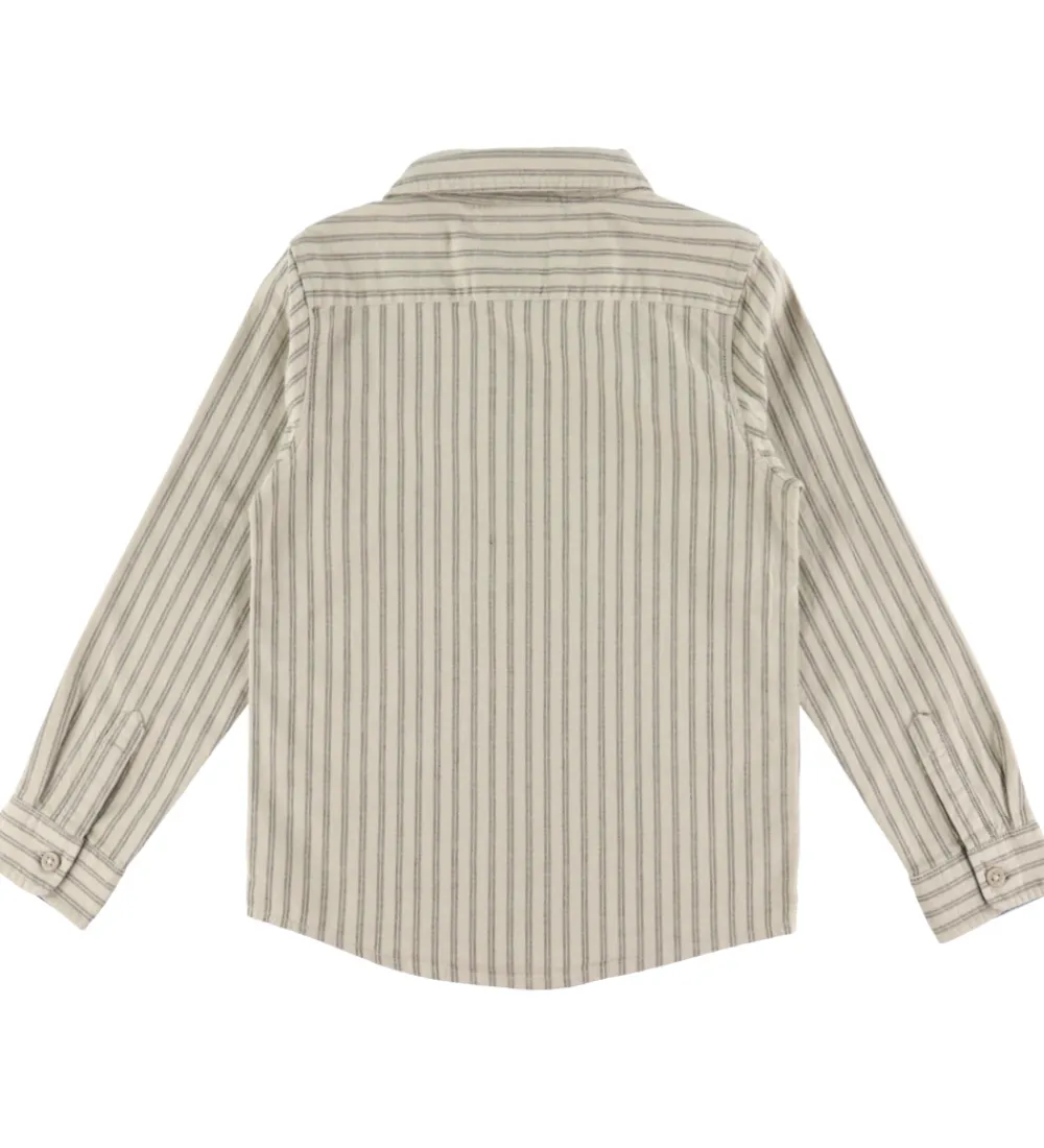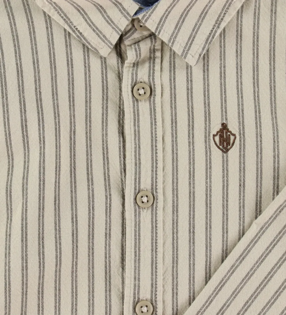 Stilren Name It skjorte med lange ærmer i en lys beige nuance med fine, lodrette striber i mørkere toner. Skjorten har en klassisk krave og en lille broderet detalje på brystet, som tilføjer et diskret præg. Name It skjortens pasform sikrer en struktureret silhuet.
