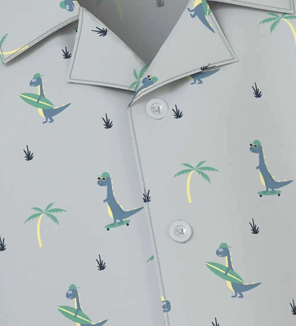 Flot Name It skjorte med korte ærmer i en lys grå farve med sjovt dino- og palmetræprint over det hele. Skjorten har knaplukning, der gør den let at tage på og af.
