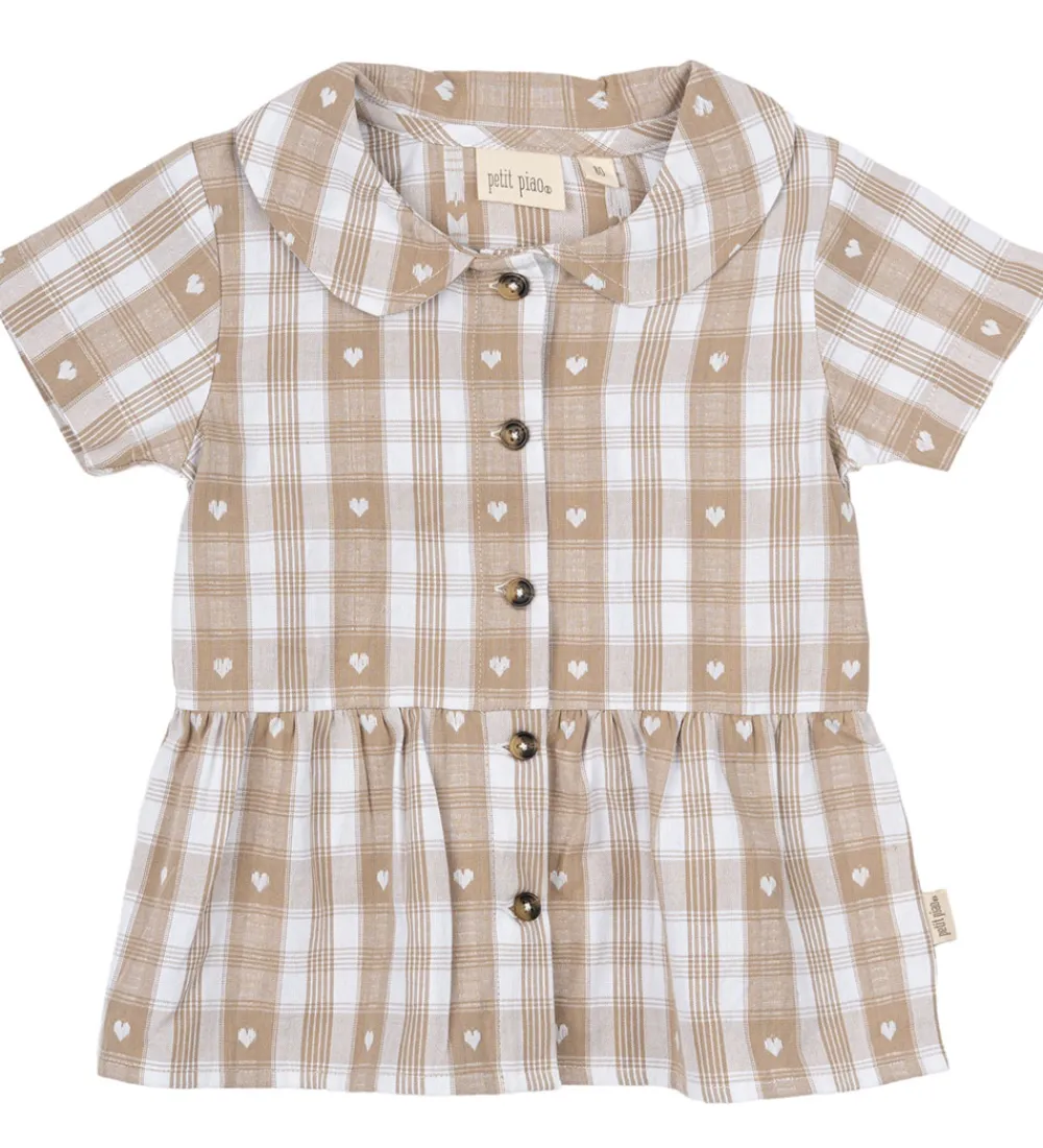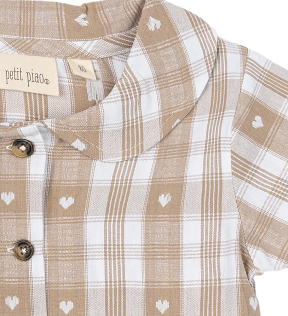 Skøn Petit Piao skjorte med korte ærmer i en off white farve med ternet mønster og små hjerteprint. Skjorten har en klassisk krave og knaplukning foran, hvilket giver et enkelt og stilrent look.
