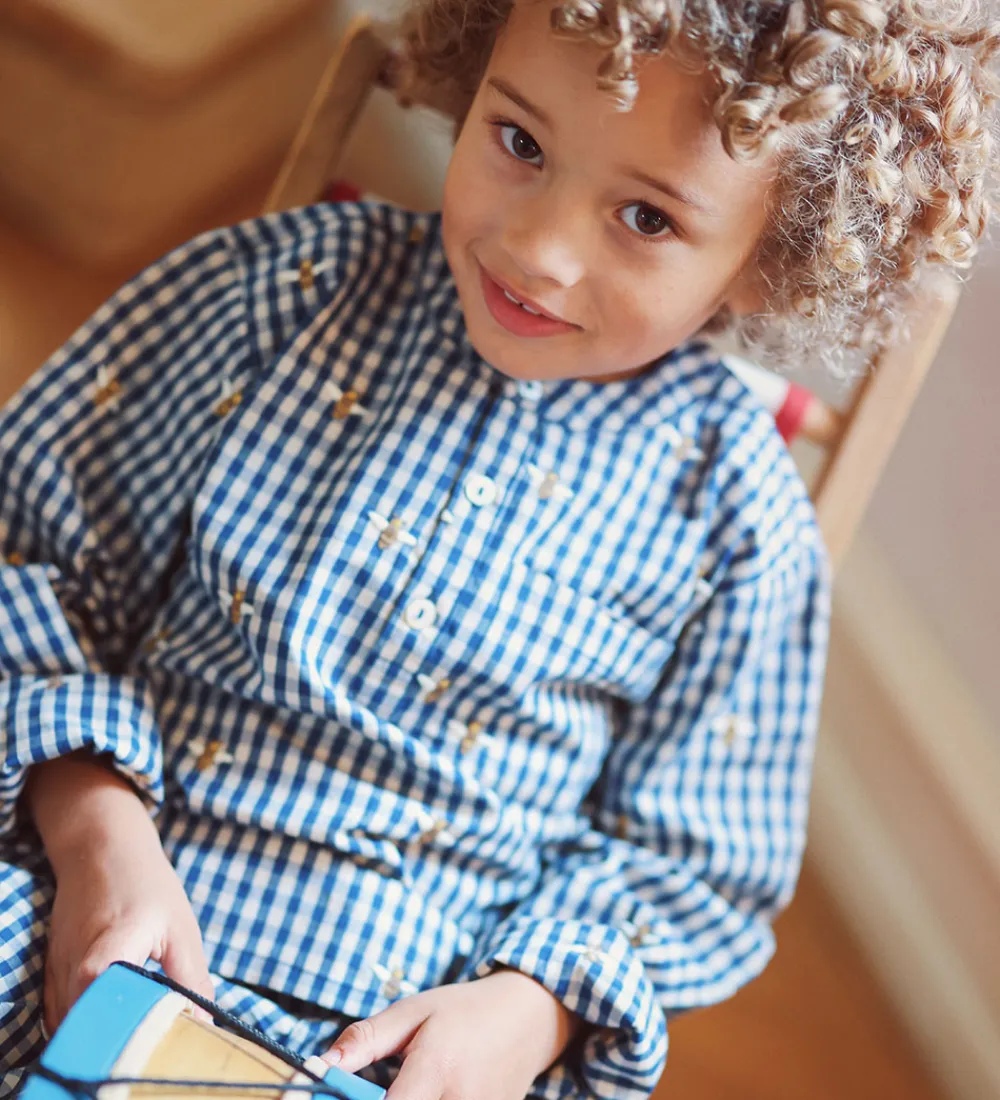 Charmerende Flöss skjorte med et klassisk, ternet mønster i blå og hvid, og er dekoreret med små, broderede bier. Skjorten har lange ærmer og en enkel krave med knaplukning foran, hvilket giver et klassisk udtryk. Skjortens struktur er let og behagelig.
