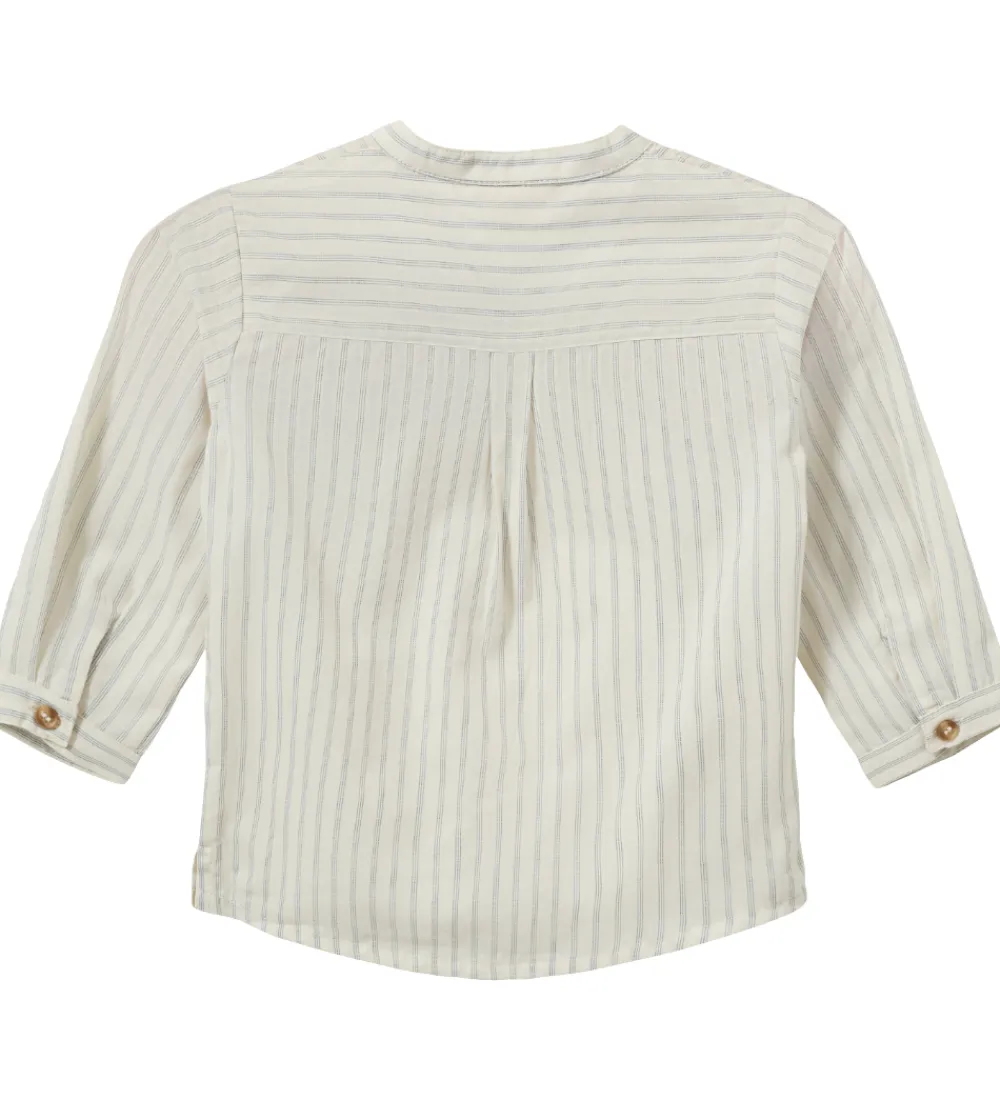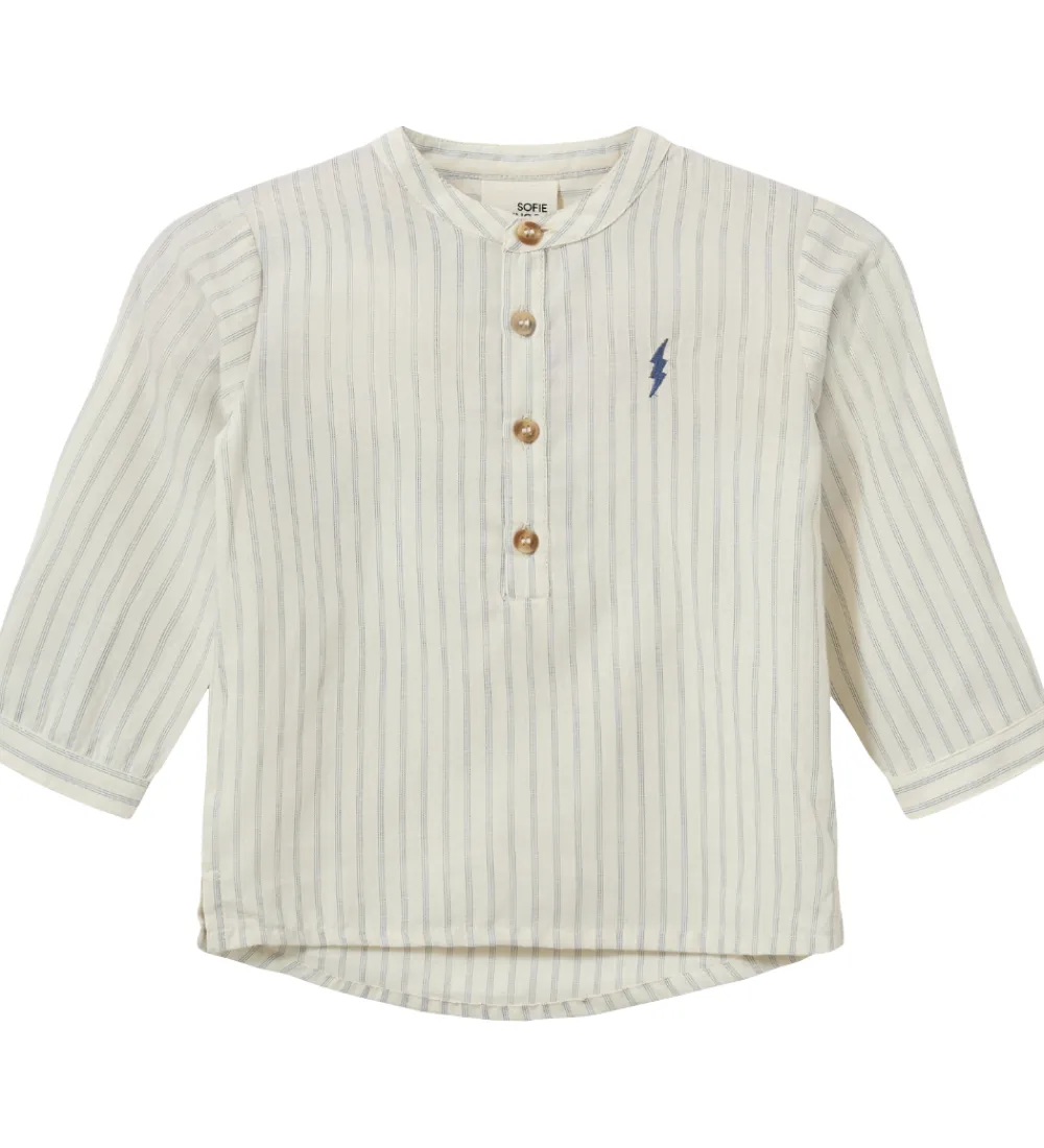Elegant Sofie Schnoor skjorte i råhvid med striber i blå. Skjorten har lange ærmer og et fint lynmotiv på brystet, hvilket giver et stilfuldt og tidløst look.