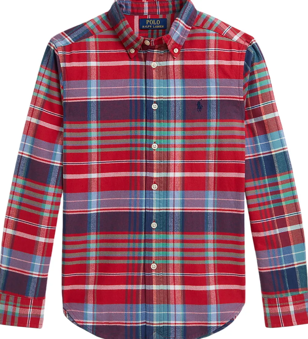 Klassisk skjorte fra Polo Ralph Lauren med et tidløst ternet mønster i røde, blå og grønne nuancer. Skjorten har lange ærmer og en traditionel krave, der tilføjer et stilfuldt element. På brystet er et diskret logo, der fremhæver Polo Ralph Laurens varemærke.