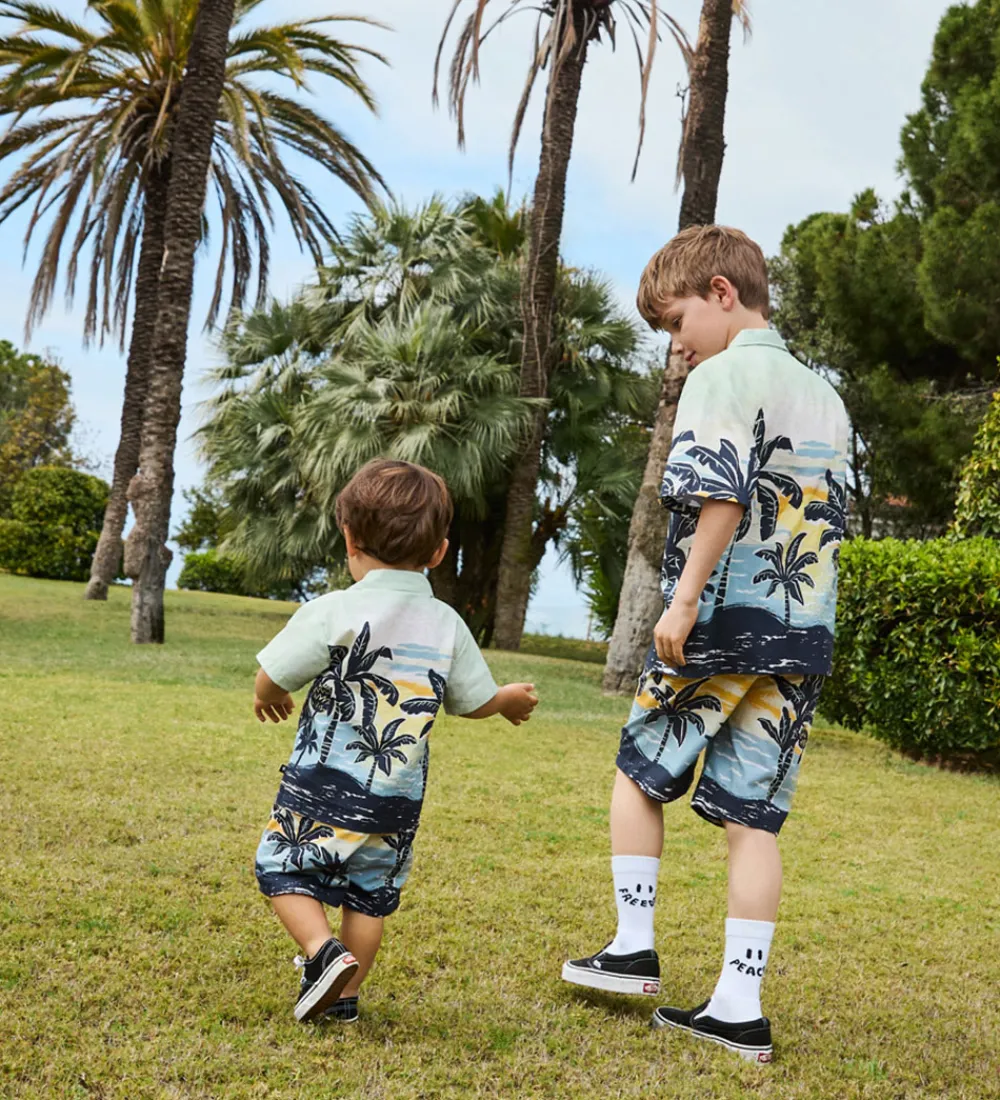 Skøn Molo skjorte med korte ærmer i en lys grøn nuance og med et stemningsfyldt palmeprint.