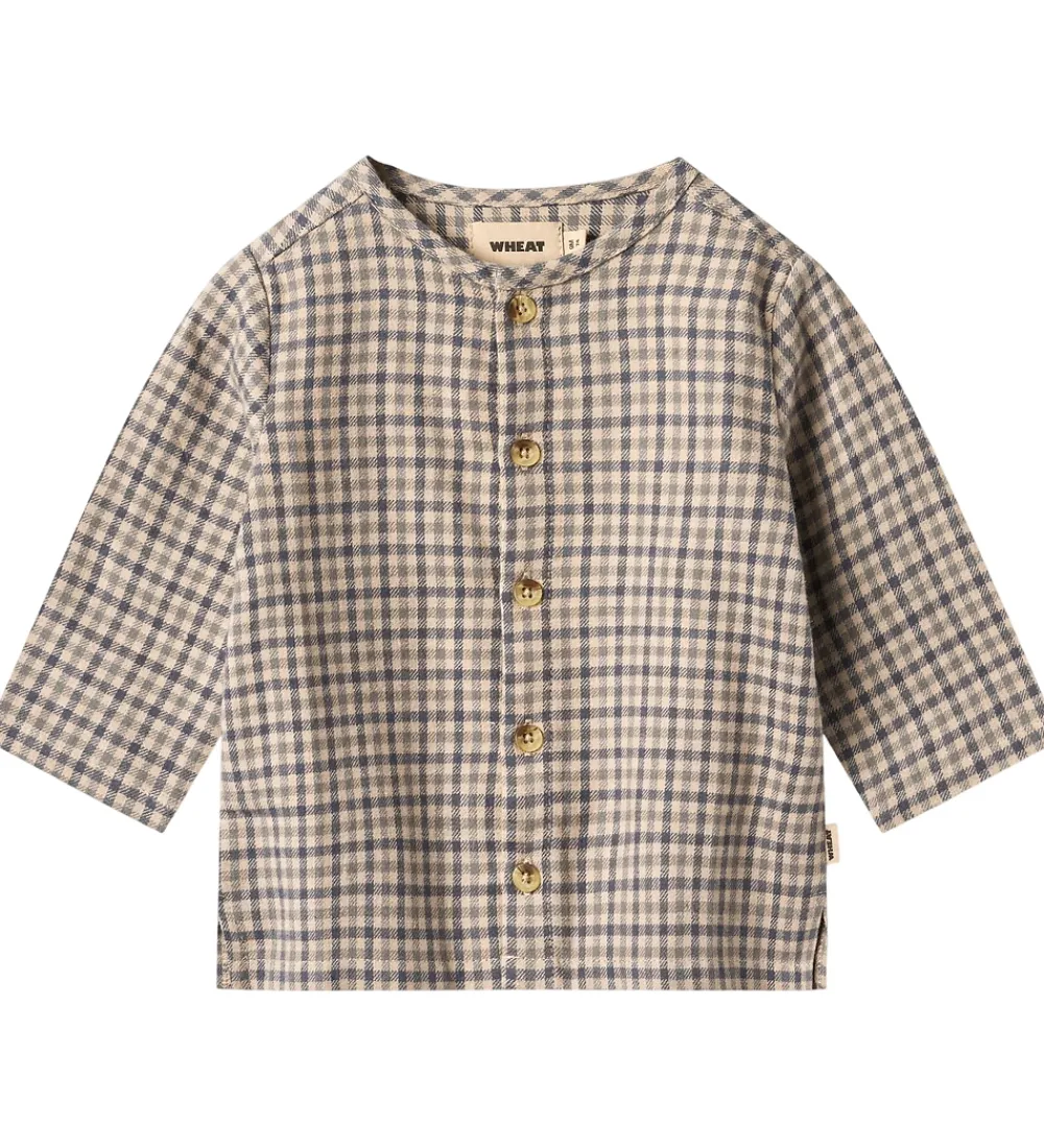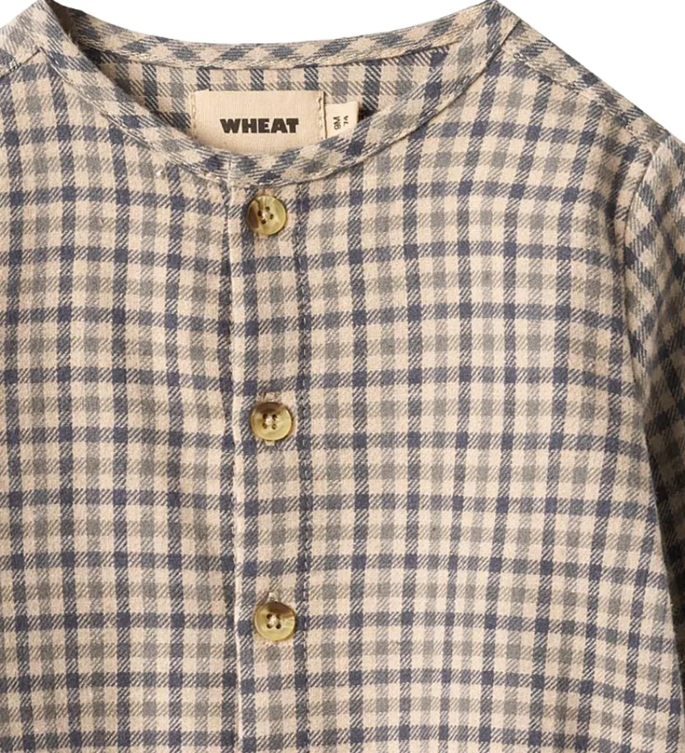 Charmerende Wheat skjorte med et klassisk ternet mønster i beige og mørkeblå. Skjorten har lange ærmer og en gennemgående knaplukning foran. Den rundede halsudskæring giver et tidløst look, mens pasformen er lige for et moderne udtryk.