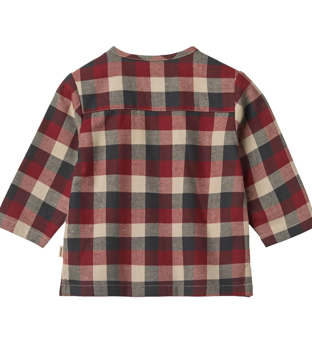 Elegant Wheat skjorte i dejlig blød flannel og i et klassisk ternet mønster i røde, mørkeblå og beige nuancer. Skjorten har en en rund halsudskæring og lukkes med dekorative knapper foran. I hver side i bunden er der en slids.