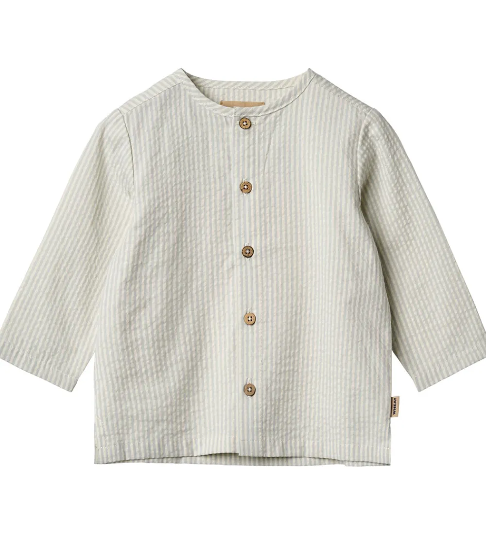 Behagelig Wheat skjorte med lange ærmer og med smalle, lodrette tstriber i hvid og lyseblå. Skjorten har en klassisk knaplukning og fine striber, der tilføjer et let og stilrent look til dit barns garderobe. Skjorten er lavet i en let, fastvævet kvalitet, og den åbnes med knapper.