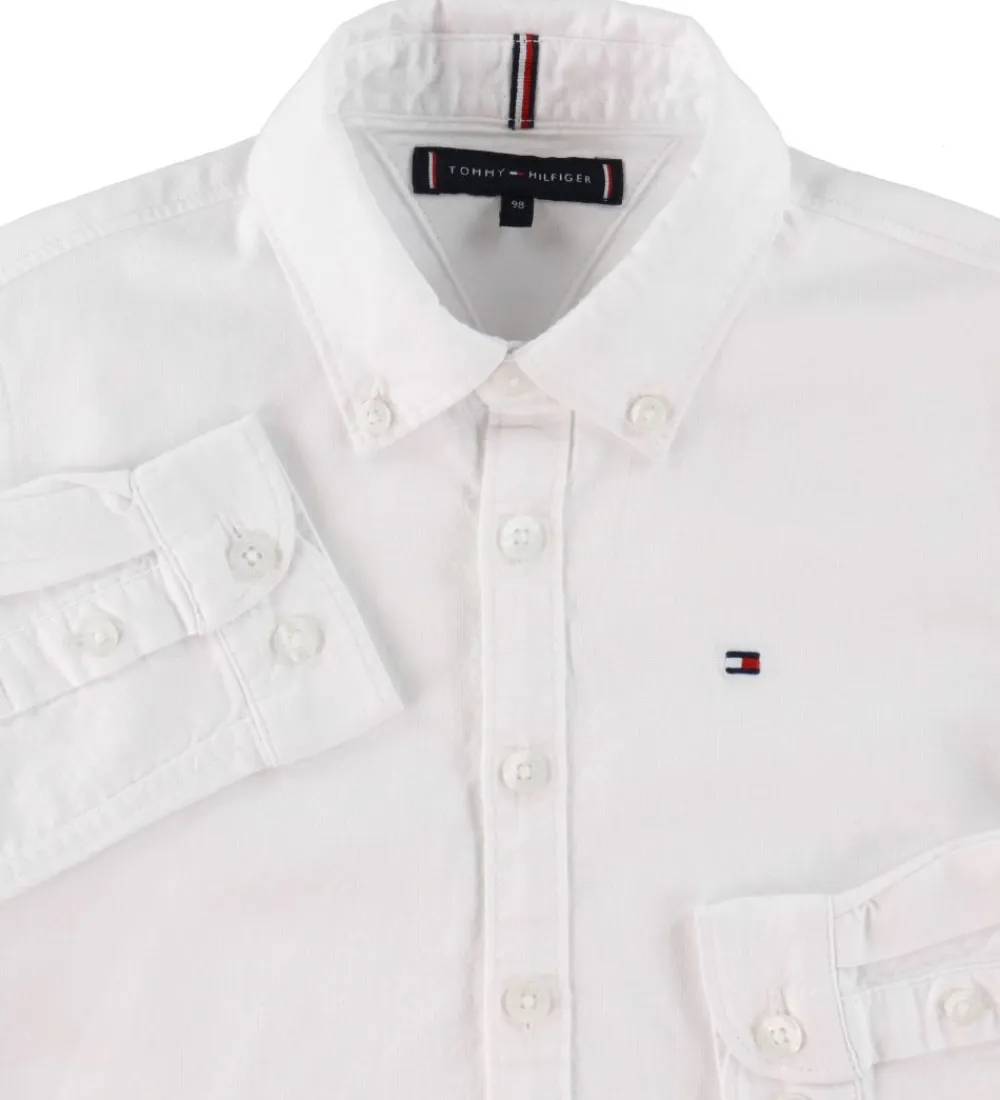 Fin Tommy Hilfiger skjorte i ensfarvet hvid med hvide knapper. Fortil er der broderet et lille logo, og som en smart detalje er den nederste knap fortil syet fast med en navy tråd.