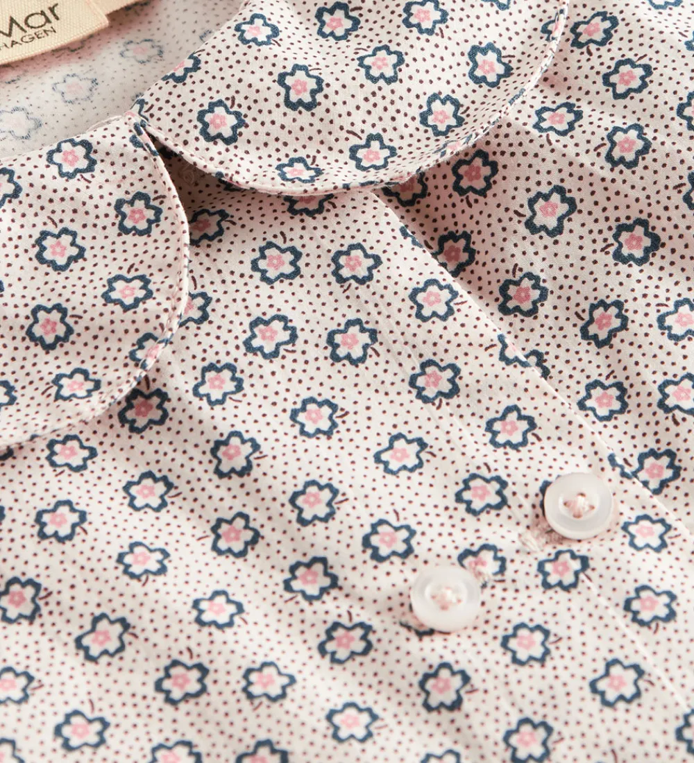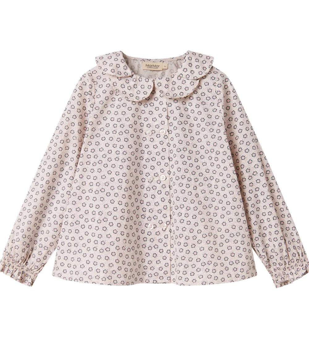 Charmerende MarMar skjorte i cremehvid med lange ærmer og et farverigt, blomstret og prikket mønster i mørkeblå, brun og rosa. Skjorten har en elegant krave med flæsedetaljer samt elastik ved ærmeafslutningerne.