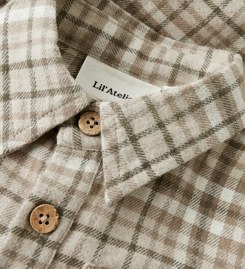 Stilfuld Lil Atelier skjortebody i beige og brune nuancer med ternet print. Bodyen har en skjortekrave med tre knapper fortil. Den har lange ærmer og en smart brystlomme. Bodyen lukkes mellem benene med trykknapper.